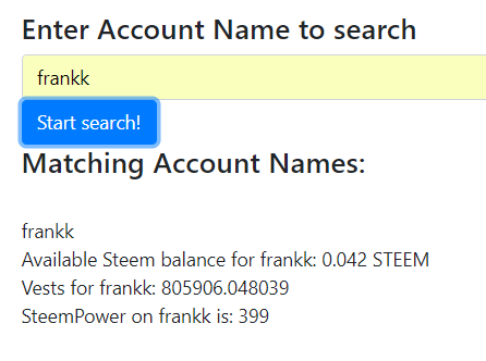 Currently it's showing the username you searched, available balance in STEEM, total VESTS for who may be interested and then VESTS converted into SteemPower itself, it isn't really accurate on bigger accounts because there is no possible way to get Steem per 1M Vests from Steemd.com anymore. But it's close enough and every now and then I could recalculate it if needed.