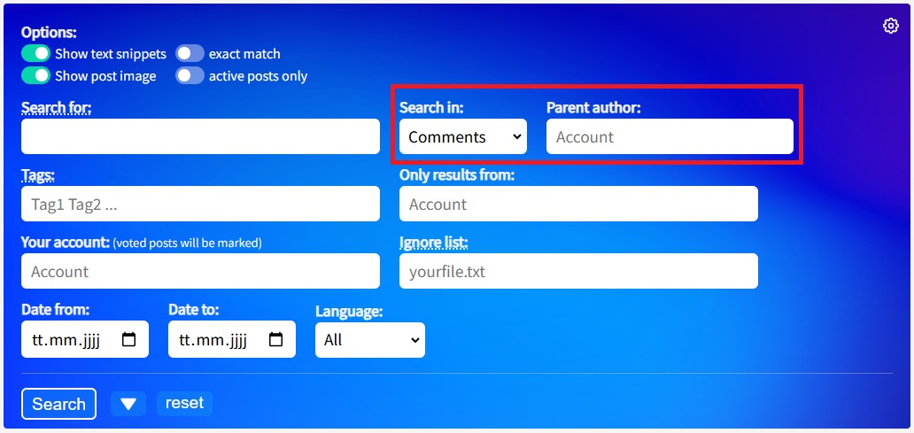 Of course, the whole thing also works the other way around! If you want to search for replies, you are the “parent author” and the user who wrote the reply must be entered under “Only results from.”