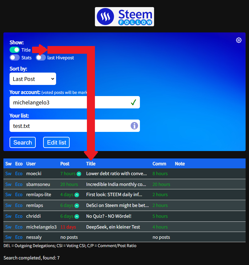 Neu ist die Checkbox "Title" mit dessen Aktivierung der Titel des letzten Posts in der Ergebnistabelle angezeigt wird.