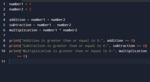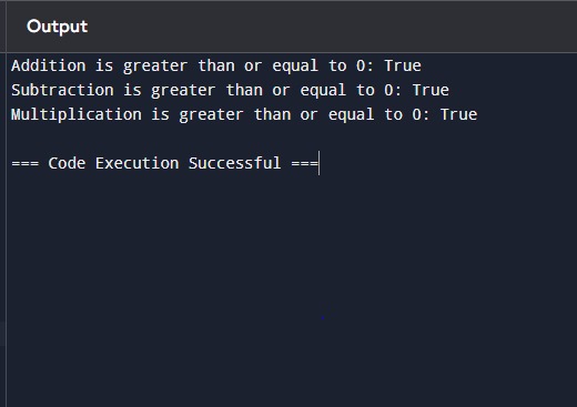 Evaluate if the results of the 3 operations are greater than or equal to 0 (>=) and show it on the screen. |