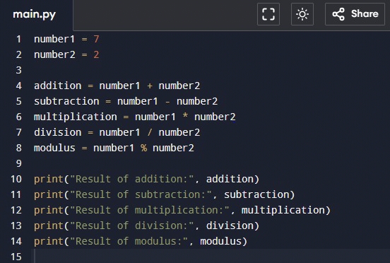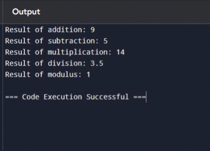 Division ÷: The division is used to divide the first value on the second value and it is represented by the symbol "/" and "÷". For example, if you want to divide seven on two the it will be,
