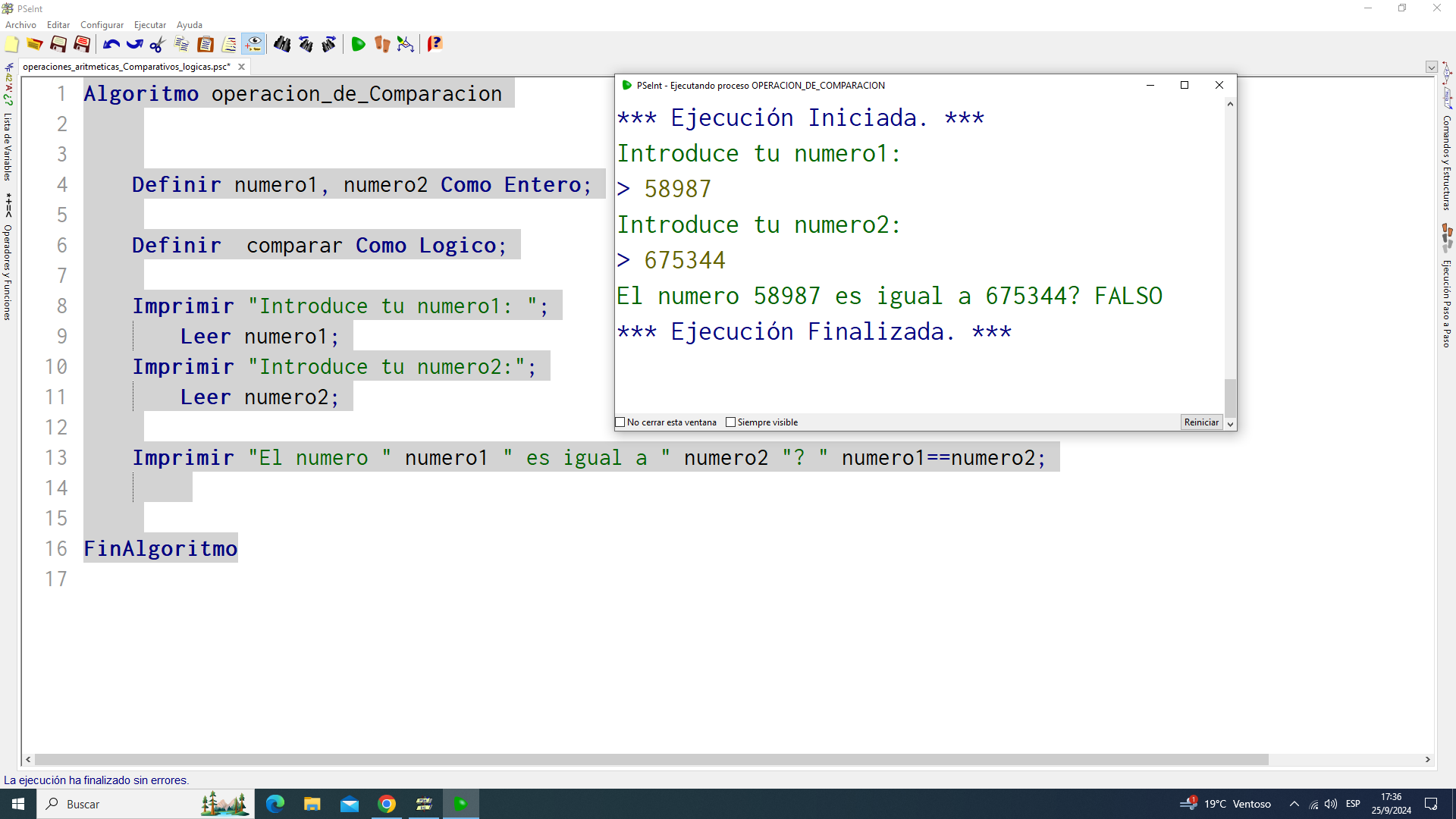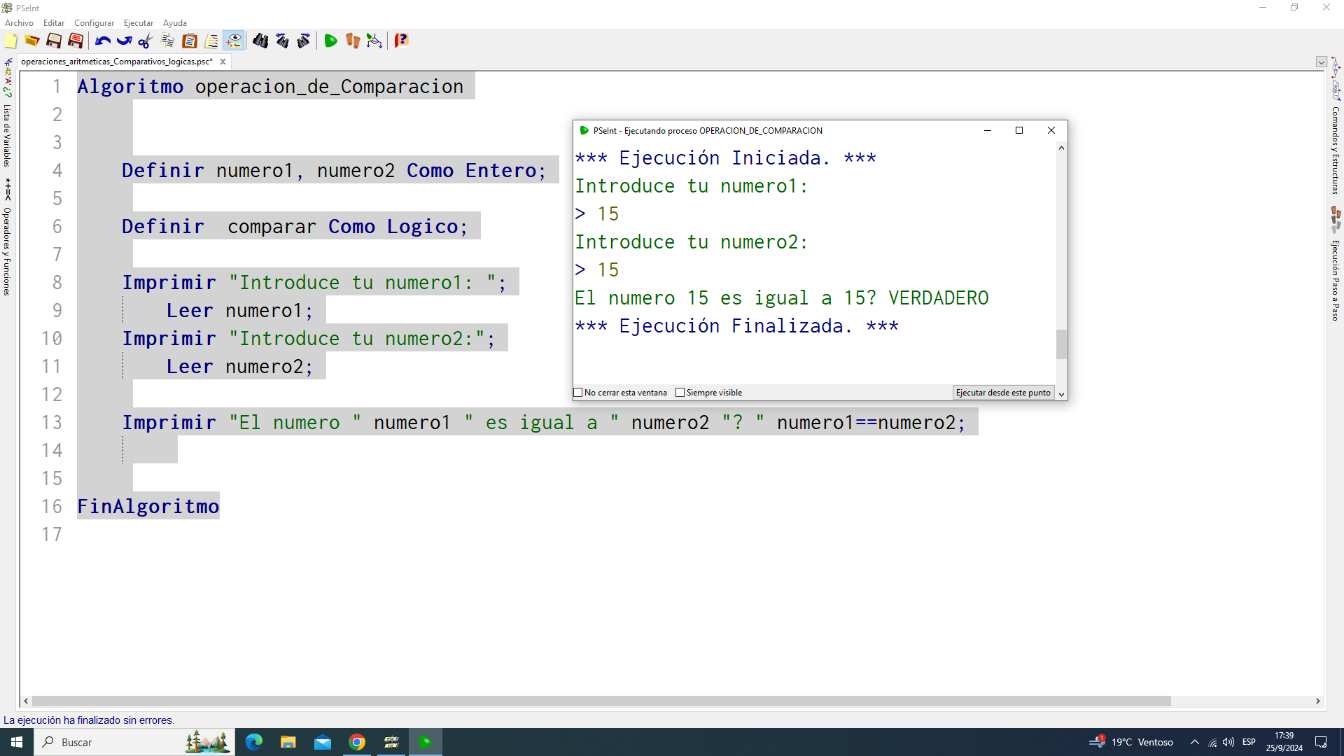 Ejecución programa: comparación de dos números: resultado Verdadero