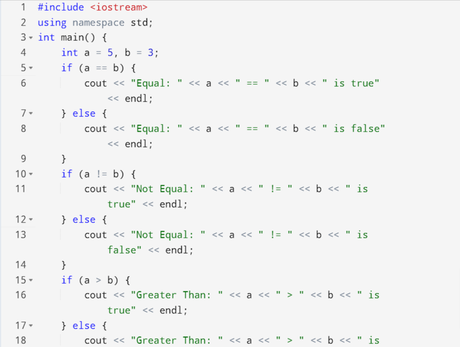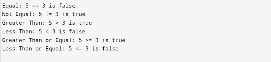 Here you can see the working of all the comparison operators I have combined all of them in a single example to show how comparison operations are carried out in programming. I have take a = 5 and b = 3.