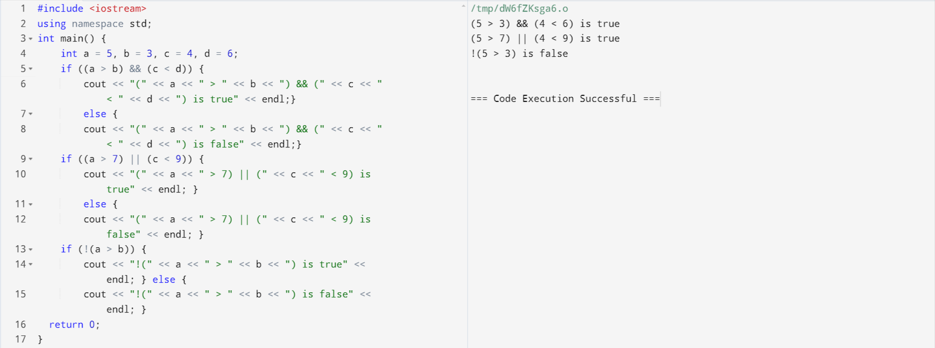 So in this way the logical operators check different conditions at once and return true or false value accordingly. (5 > 3) && (4 < 6) returns true because both conditions are true.