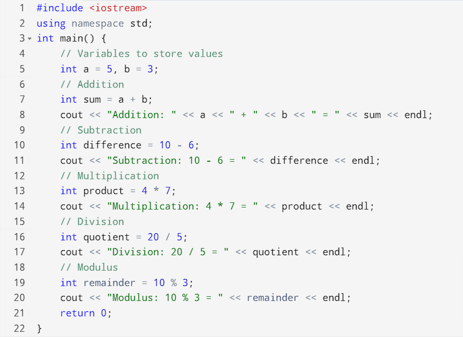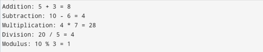 Arithmetic operations perform the basic mathematical functions. They are used for the calculations and data processing. We can use them to manipulate the numeric values in programming. Common arithmetic operators are given below: