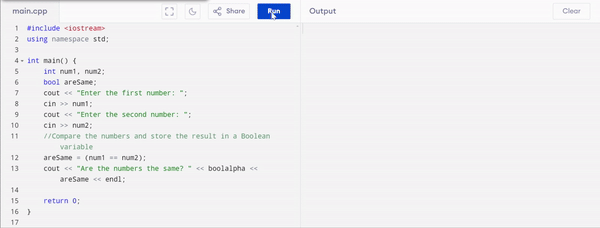(num1 == num2)to the Boolean variableareSame. - Output Display if the numbers are same, "Are the numbers the same?" followed by the Boolean result stored in