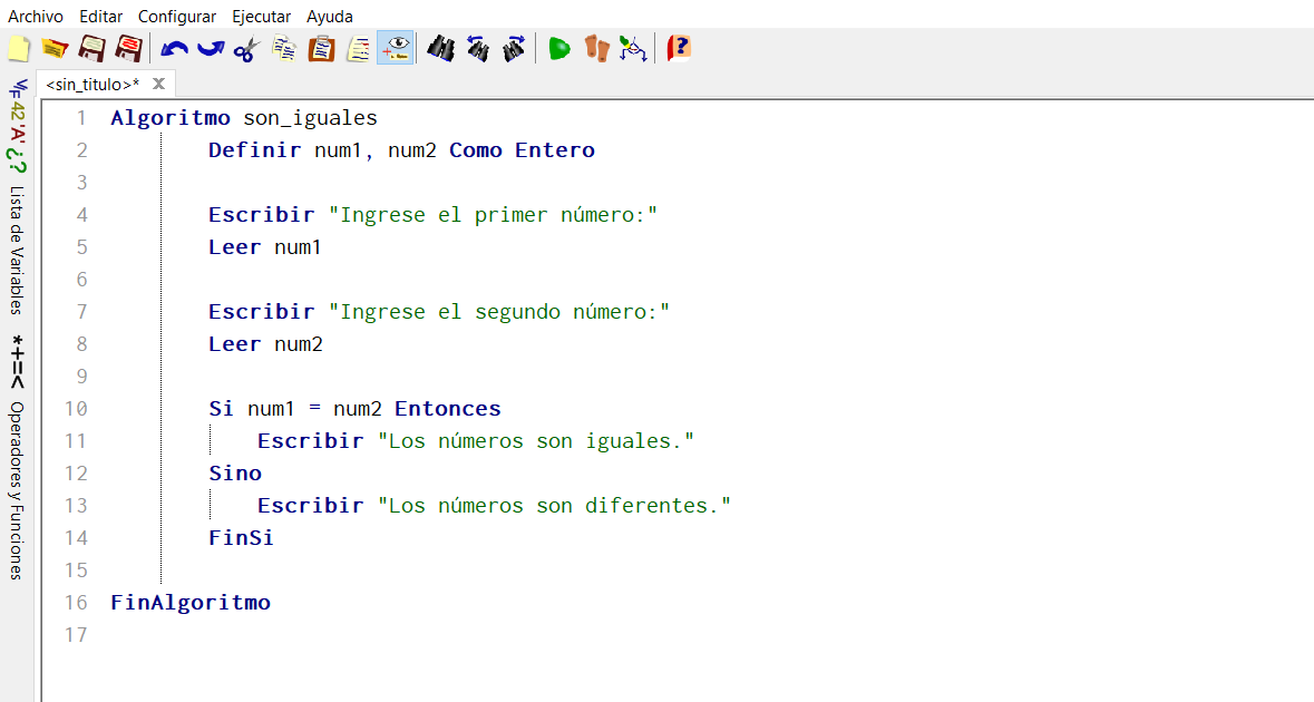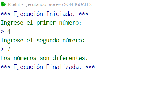 Displays the result: If the numbers are equal, it displays the message "The numbers are equal". Otherwise, it displays the message "The numbers are different".