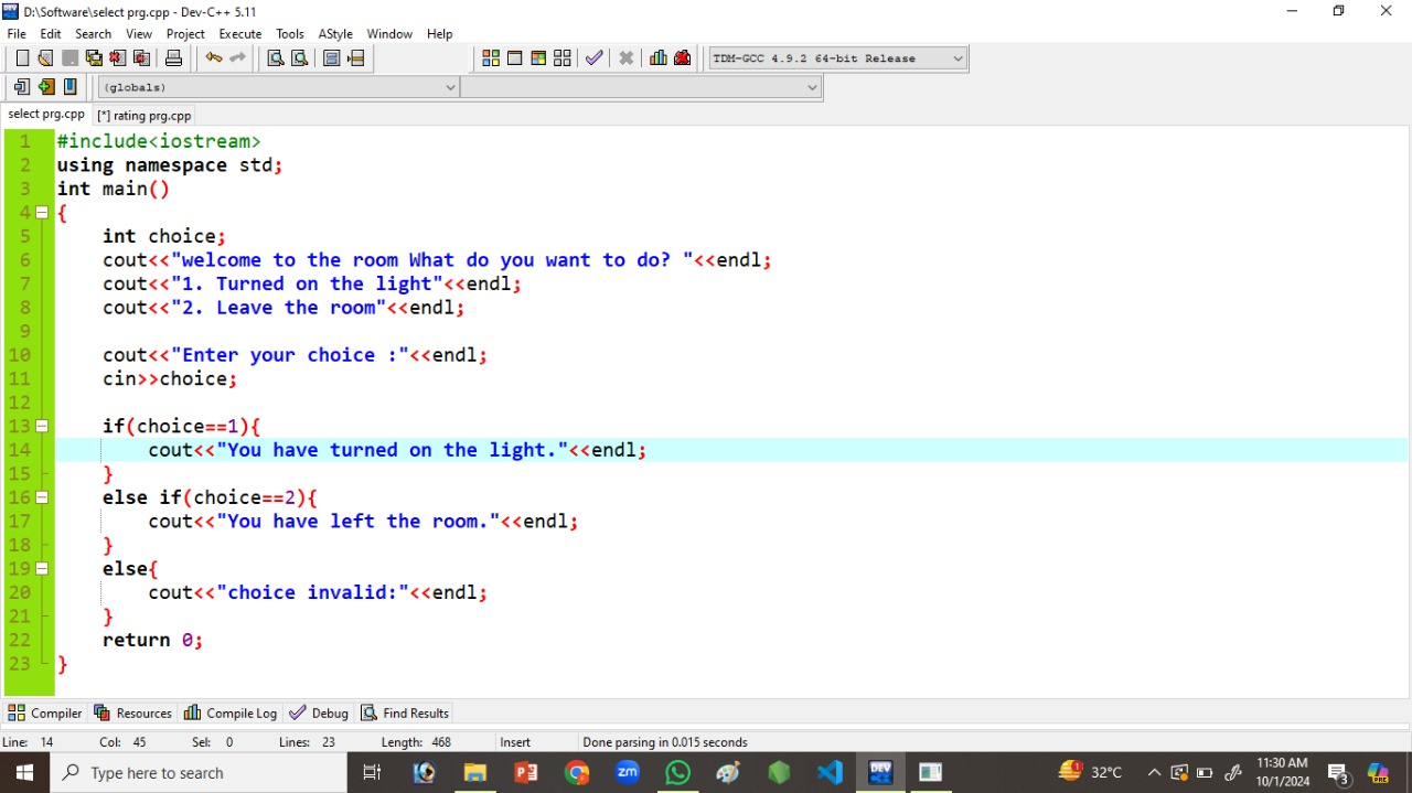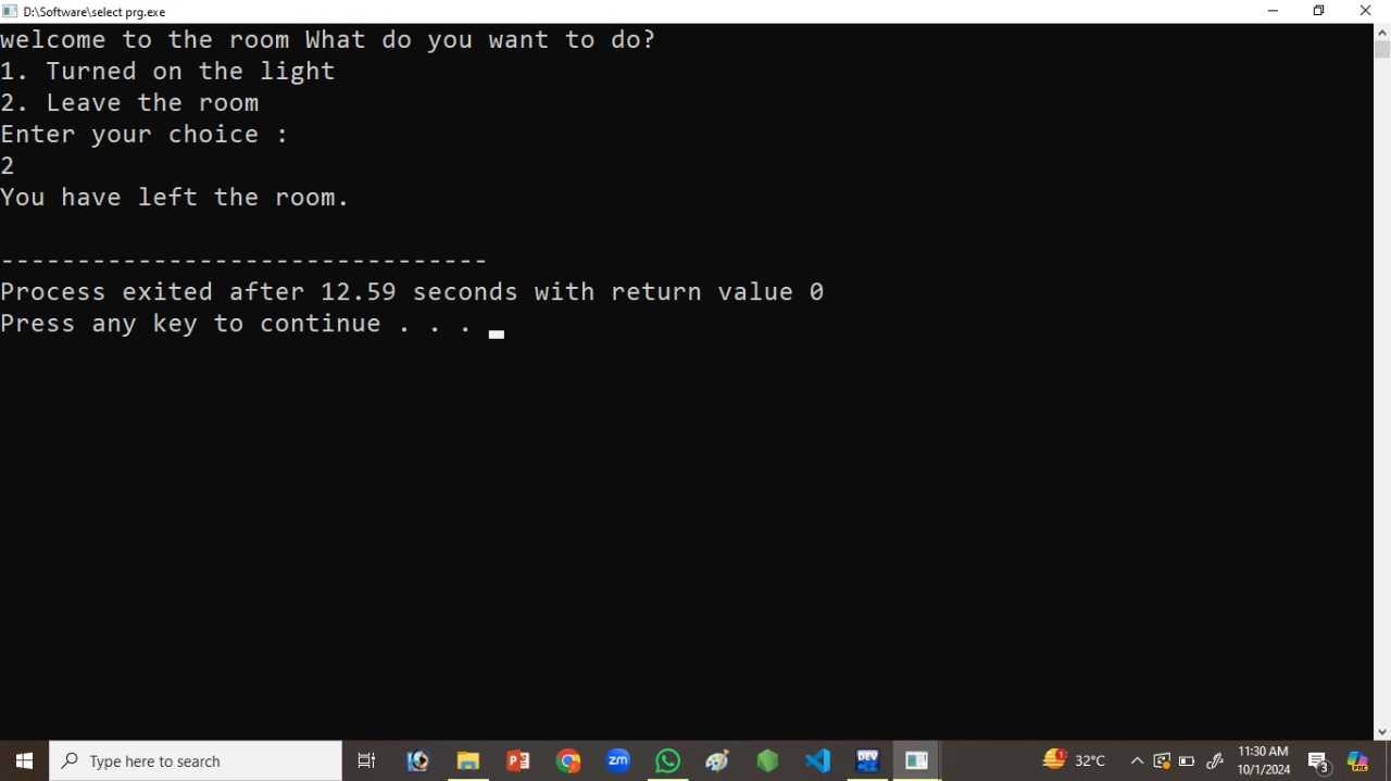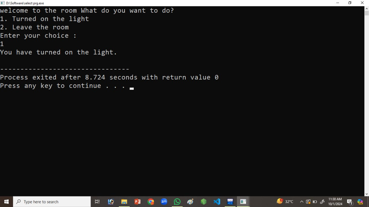 Here I will show you the program in which I i write 1 then it will show that you turned on the light. And If I will type 2 , then It will show you have left the room. And I will use it by using conditions. That is very necessary. Because condition is very necessary in this program