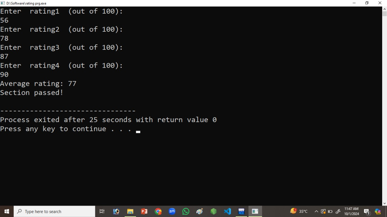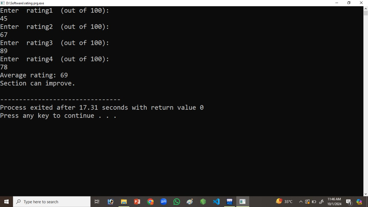 In this program, we will show 4 numbers that will be on rating. And I will show you the average rating. And then according to the code. it will show that if then average rating will be less then 70 then It will show section can improve. . And then If the average rating will be greater then 70 then it will show section will be passed
