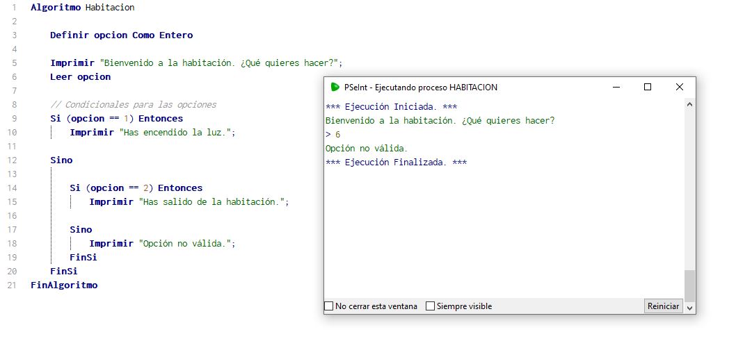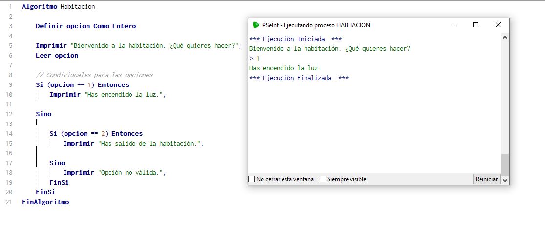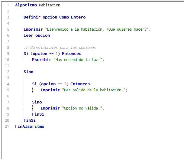 - Luego viene las opciones condicionales, donde el usuario si coloca la opción 1 le sale el mensaje: Has salido encendido la luz y si elije la opción dos el programa muestra un mensaje en pantalla que dice: Has salido de la habitación.