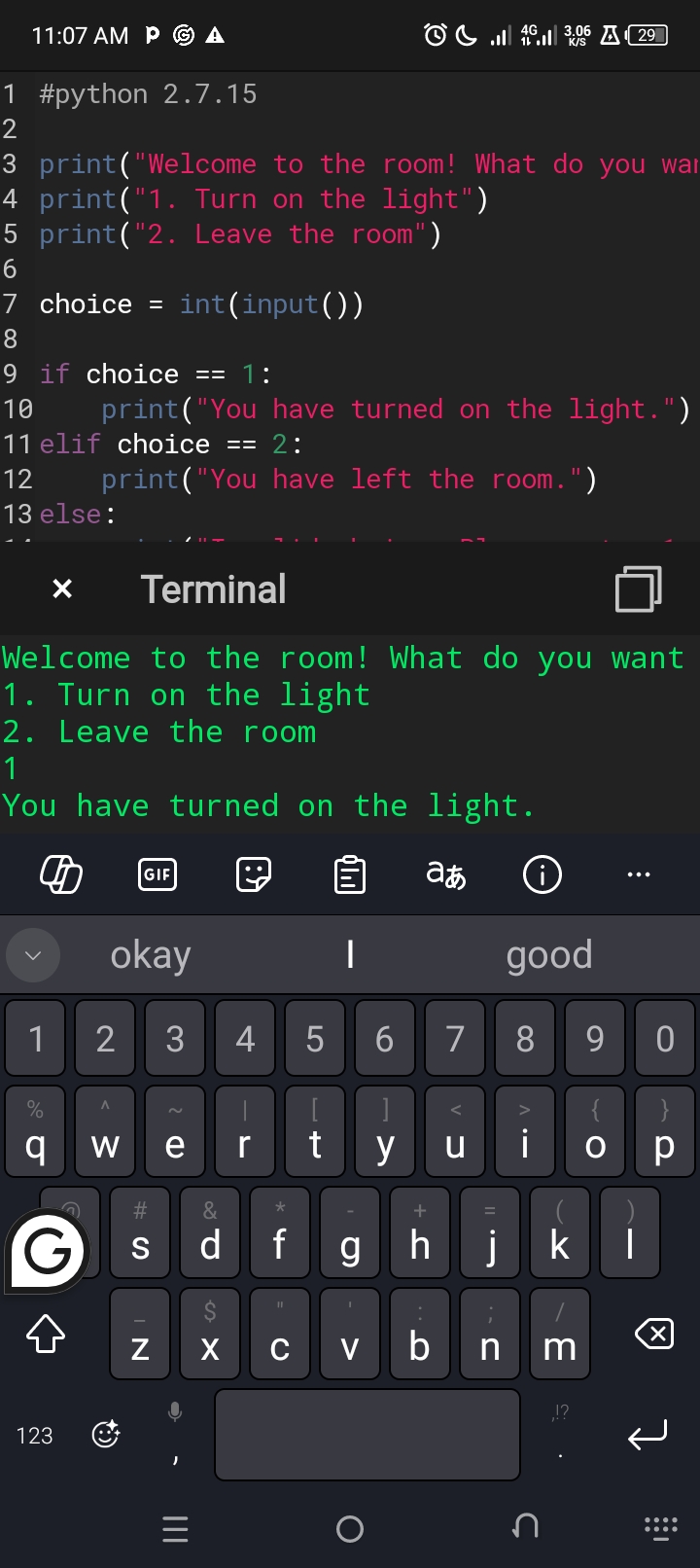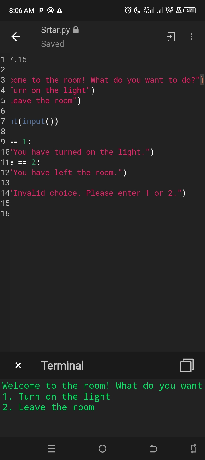 The code and terminal is on left and the display of the code and terminal when I choosed option 1 is on the right