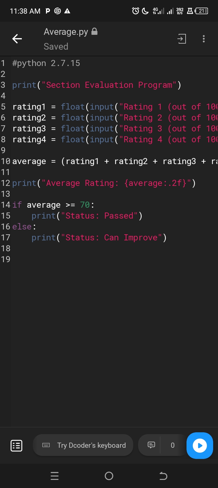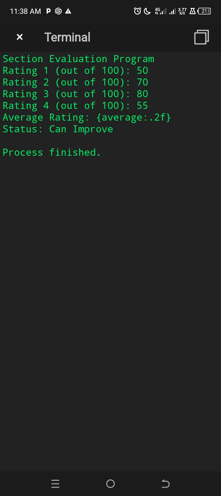 This particular image has the program and the outcome when I inserted digits that in calculating will not give me an average greater than 70, it shows can Improve as the consequence of the conditions