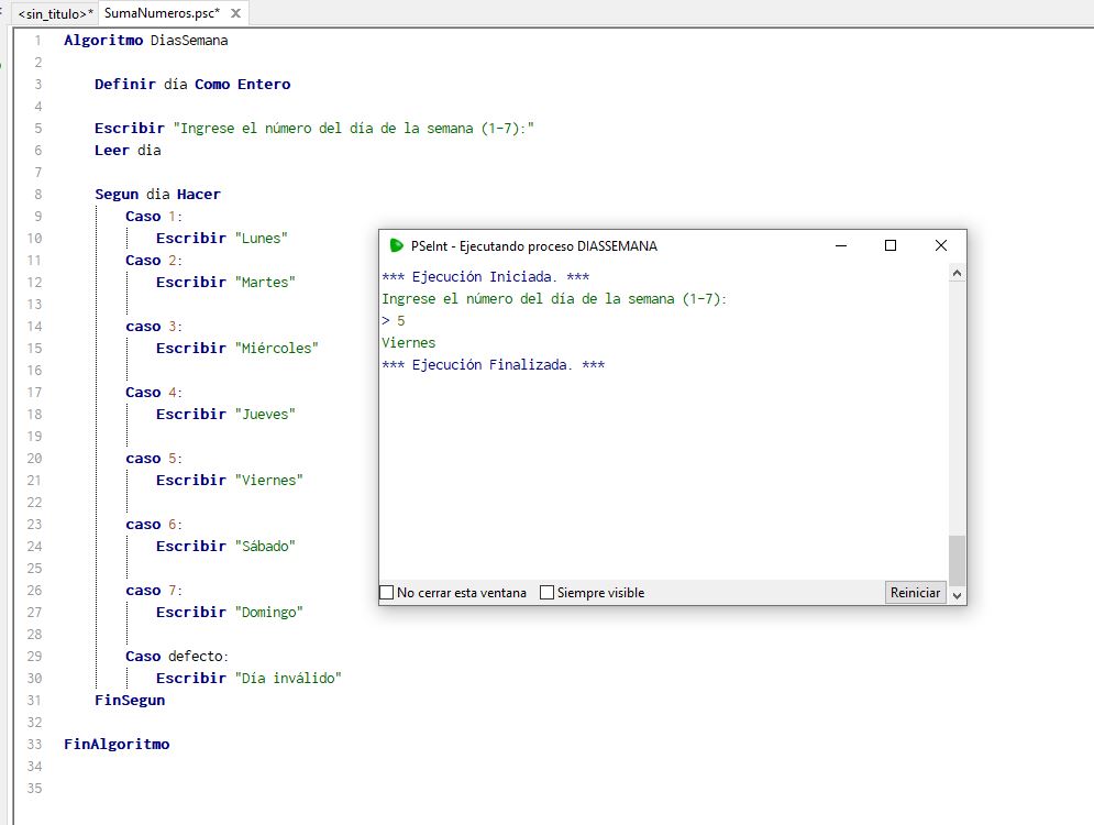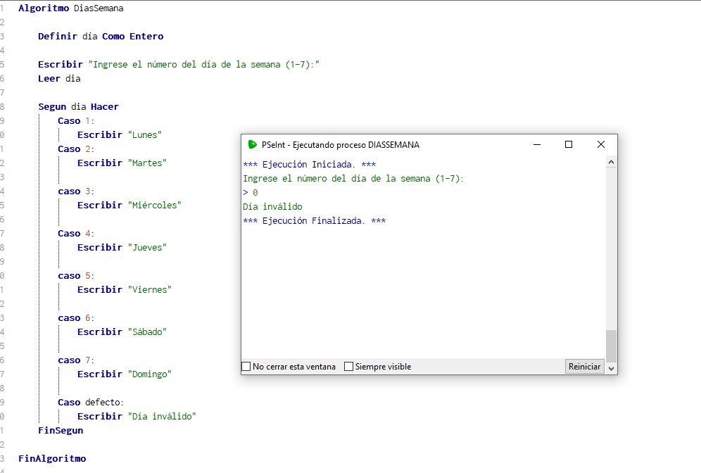 En este ejemplo, el programa solicita al usuario que indique un número del 1-7, según el número que elija el programa va a mostrar en pantalla el día de semana. Para poder hacer esto posible utilicé la estructura según-caso, la variable “dia” captura el número ingresado por el usuario y según sea el caso, mostrara el dia de la semana, como son siete días se utilizó siete casos, uno por día y de introducir un número diferente, el programa mostrará un mensaje: “Día inválido”.