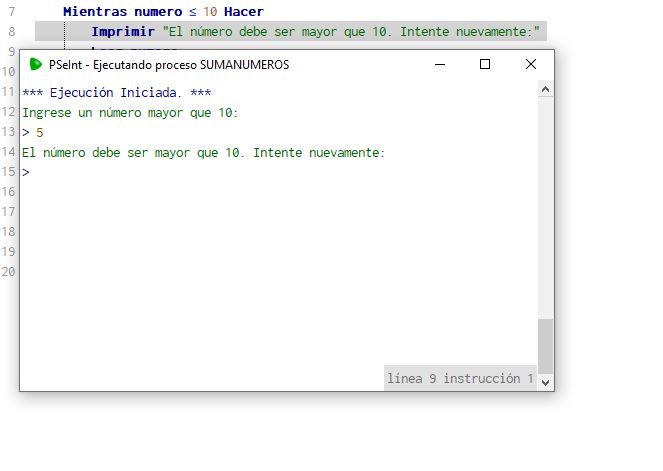 Luego utilicé la estuctura de control (Hacer-mientras), ya que el programa solicita al usuario un numero mayor de diez, de ser falso,muestra un mensaje en pantalla: