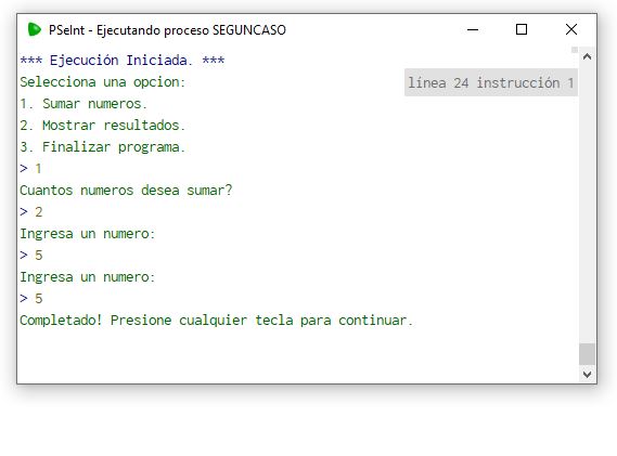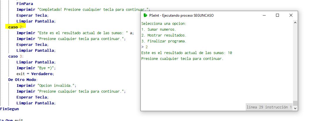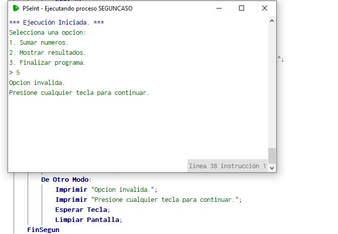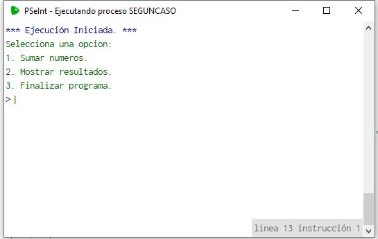 El programa entra en un blucle donde nos sale un menu de opciones (dichas opciones con segun-caso) donde el usuario tiene tres de ellasa a elegir, la opción uno es: sumar números, la opción dos: mostrar resultado y la opción tres: Finalizar el programa.