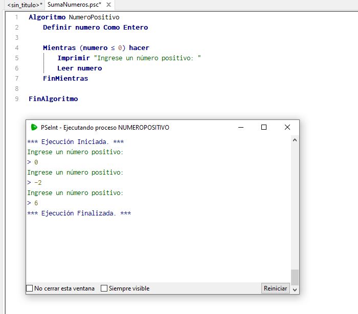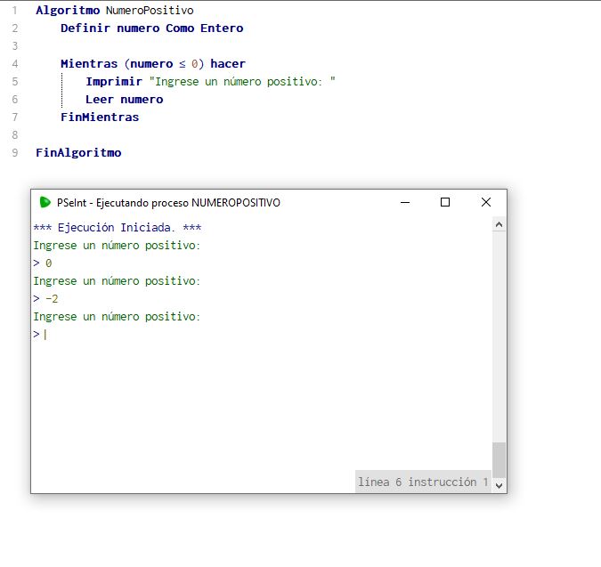 Como pueden notar, el programa pide al usuario que ingrese un número positivo, si el usuario se equivoca y colocar un número negativo o cero, le volverá a pedir nuevamente que ingrese un número. Si el numero ingresado es positivo, el ciclo termina.