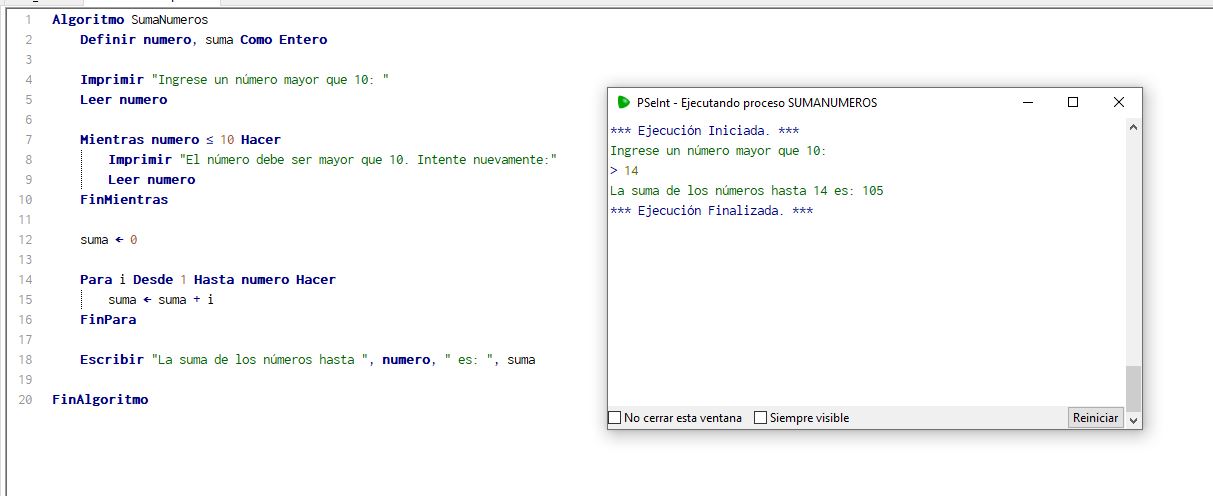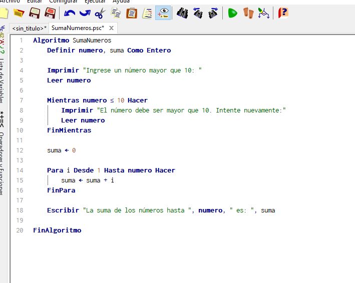 Escriba un programa en pseudo-codigo que pida al usuario un numero mayor que 10 (Hacer-Mientras), después sume todos los números con un acumulador (Mientras) Ejemplo: El usuario introduce 15. El programa suma 1+2+3+4+5+6+7+8+9+10+11+12+13+14+15.