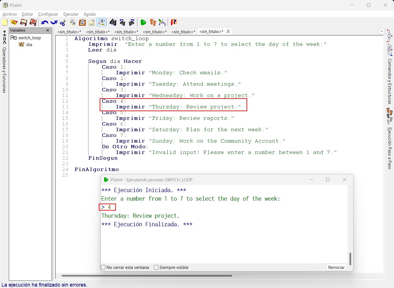 Next is the switch loop case, for another logic. The switch makes use of the value of the op. Our program has three cases.