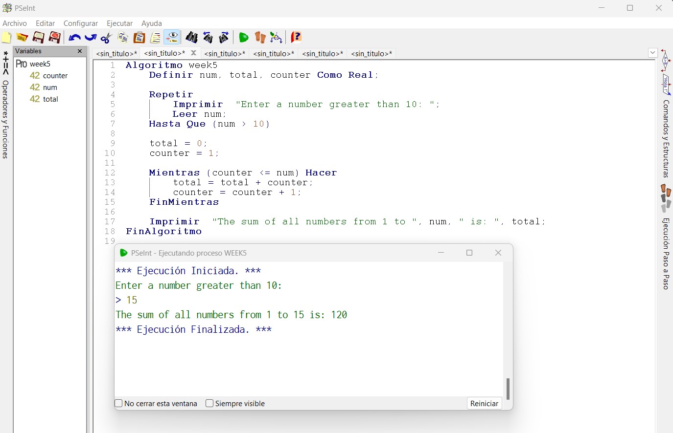 Write a program in pseudo-code that asks the user for a number greater than 10 (Do-While), then add all the numbers with an accumulator (While) Example: The user enters 15. The program adds up to 1+2+3+4+5+6+7+8+9+10+11+12+13+14+15.