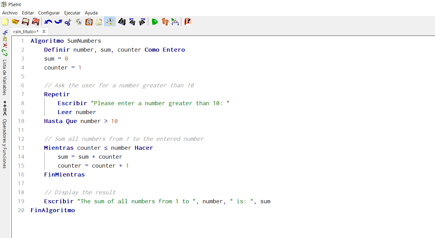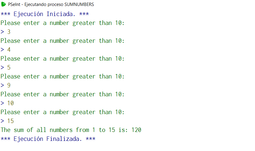 Write a program in pseudo-code that asks the user for a number greater than 10 (Do-While), then add all the numbers with an accumulator (While) Example: The user enters 15. The program adds up to 1+2+3+4+5+6+7+8+9+10+11+12+13+14+15