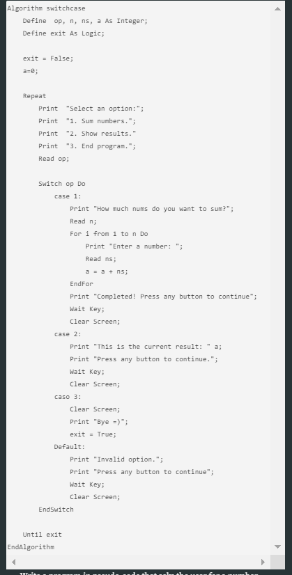 The program waits for the user to input a choice (op), which is handled by the Switch statement.