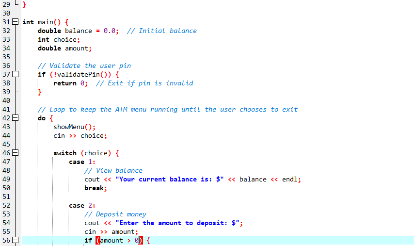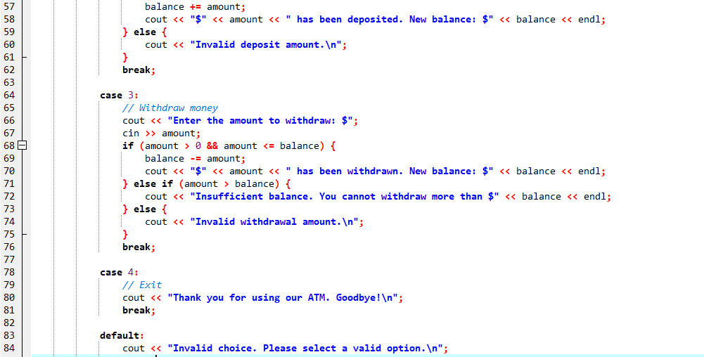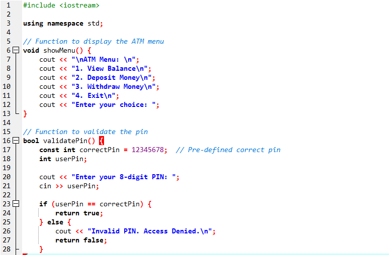 The ATM will work in such a way that first, it will ask us for the PIN code, if the PIN code is wrong, it will not proceed further. If the PIN code is correct then our ATM main menu will open which will have four options. One option is to view balance, the second is to withdraw money, the third is to deposit money and the fourth is to exit the program.