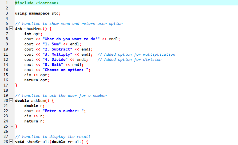 Now I have updated the show menu option. Multiplication and division have been added to it at numbers three and four. So that they can be used with the rest of your operators.