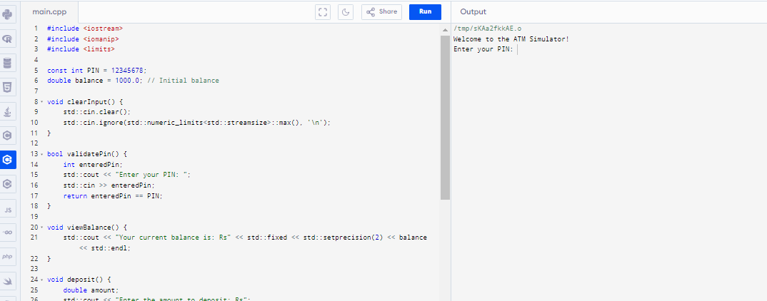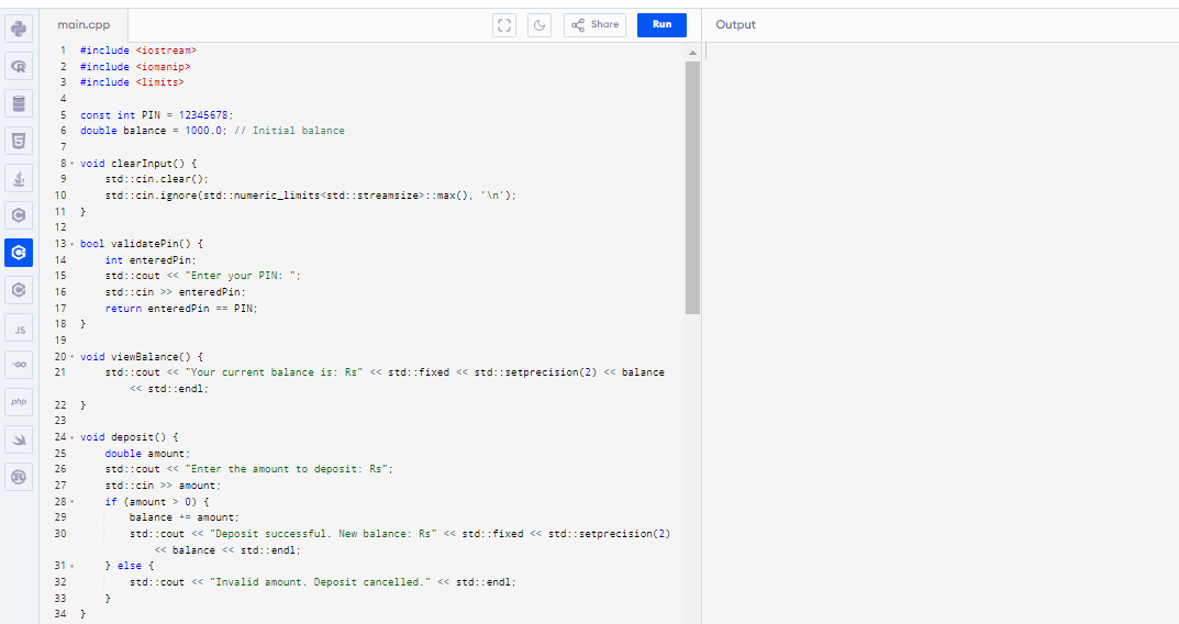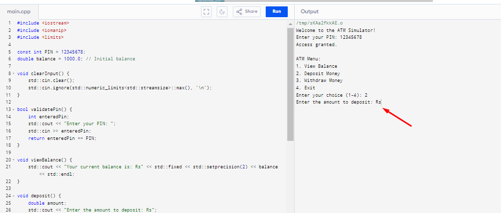 The clearInput() function is used to clear any invalid input to prevent infinite loops in case of incorrect input types.The balance is initialized to Rs.1000.0 for demonstration purposes. You can modify this initial balance as needed.