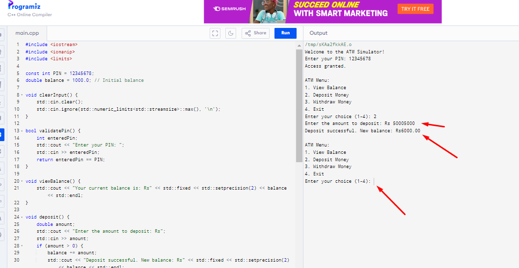 It asks to enter the amount to withdraw, I entered Rs 2000 and it shows a balance of Rs 4000, these the code was successful.