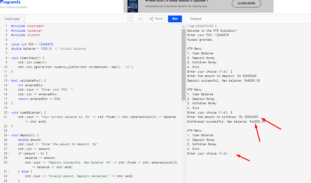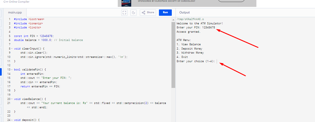 The program starts by asking for a PIN. If the correct PIN is entered, it grants access to the ATM menu. The user can then choose from the available options until they decide to exit.