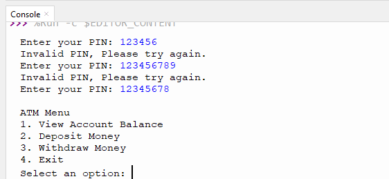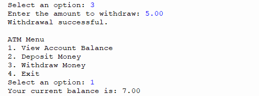 After validating the PIN, I enter a loop that displays the main menu to the user using the showMenu function. Depending on the user's choice, different actions are performed. If the user chooses to view the balance, the viewBalance function is called, if the user chooses to deposit money, depositMoney is called, and to withdraw money, the withdrawMoney function is used. If the user decides to exit, the exitProgram variable is set to True, which ends the loop and terminates the program execution.