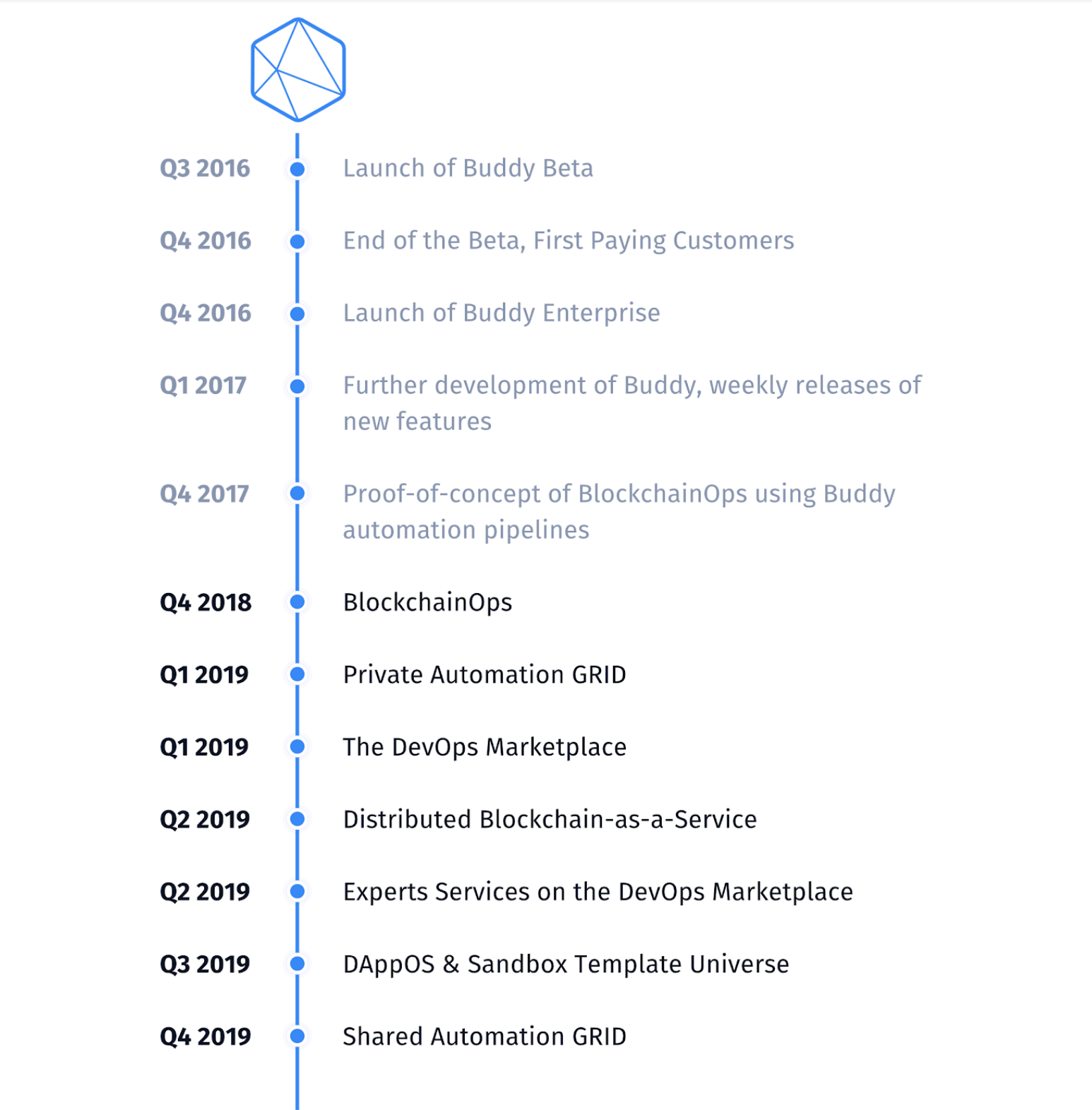 Buddy development dates as far back as the 3rd quarter of 2016 when the Buddy beta was launched. The beta testing ended in the 4th quarter of 2016 when the buddy enterprise was launched. Further development on the platform continued form the 1st quarter of 2017 all through to the 4th quarter of 2017. By the 4th quarter of 2017, the proof of concept of the blockchain ops using automation pipelines occured. The 3rd quarter of 2018 is when the tokensale will take place followed by the launch of the blockchainops by the 4th quarter of 2018. The privation automation grid will b e functional by the 1st quarter of 2019 as well as the Devops marketplace. The 2nd quarter of 2019 will see the distributed blockchain as a service as well as experts services on the devops marketplace. The Dapps OS and the sandbox template universe will be launched by the 3rd quarter of 2019 and the shared automation grid will be launched by the 4th quarter of 2019.
