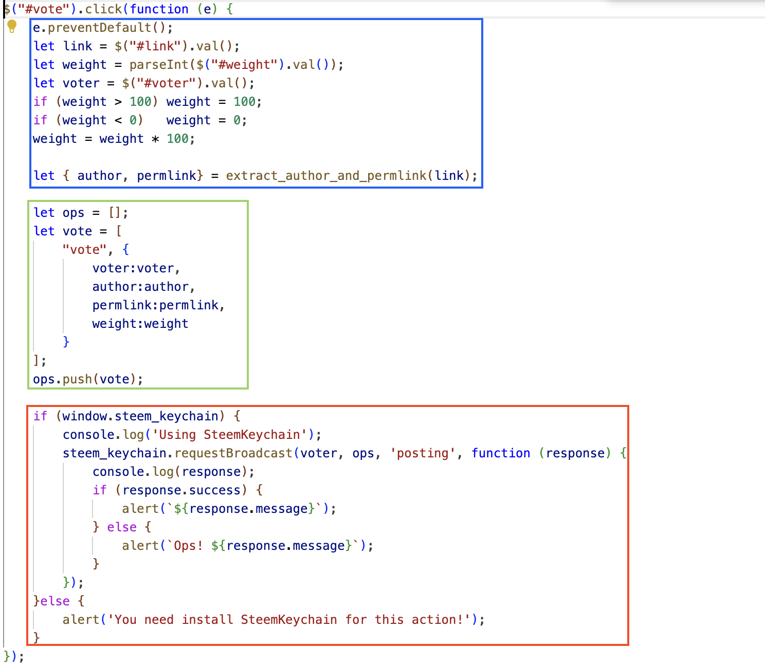 In the blue part I got the data using JQuery, and I made the necessary conversions, in the case of the weight of the vote it cannot be greater than 100 or less than 0, and once the limits are established this value is multiplied by 100 since it is expressed at the level of the blockchain. I used the function I created previously and obtained the two necessary values from the post we are going to vote on.