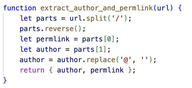 Then in the JavaScript script I created a function to extract the author and the permlink from the URL, I simply separated the URL using the character '/', I turned it over and everything that is in the first part is the permlink, and in the second part the author, from the latter I removed the arroba since it is not necessary.