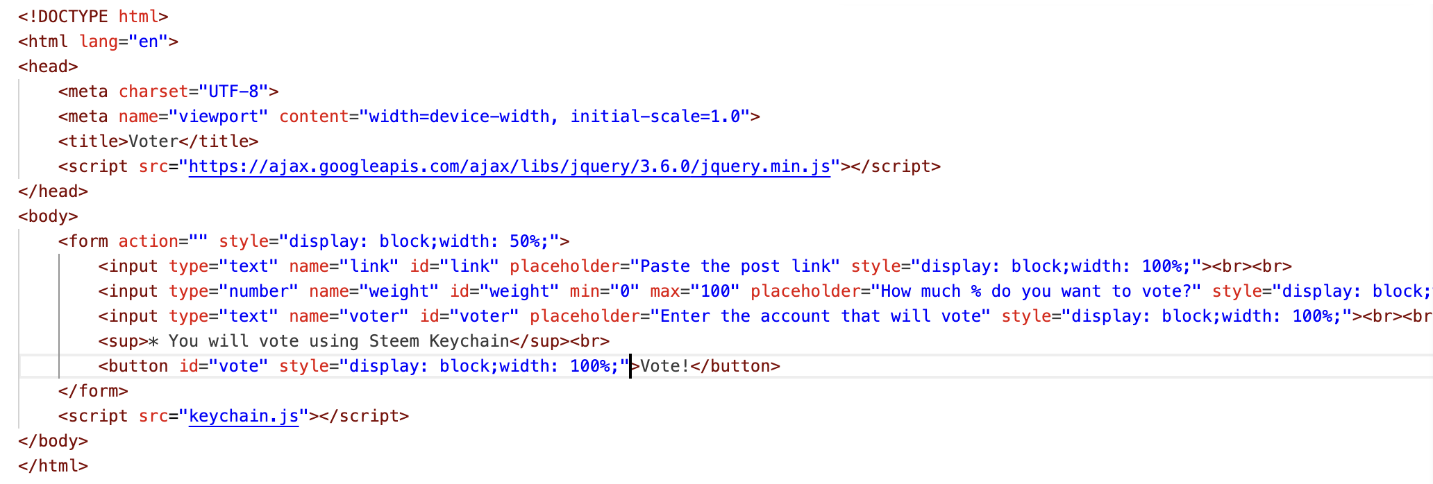 We are going to create a simple interface in HTML where we will ask for the link of a post and vote for that publication using Steem Keychain.