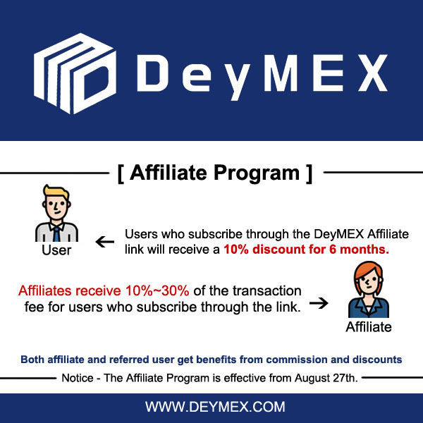 DeyMEX의 모든가입자는 추천링크(URL)을 부여 받게 되며, 이 추천 링크를 클릭하여 가입 한 유저는 6개월간 10%의 거래수수료 할인 혜택을 받을 수 있습니다.
