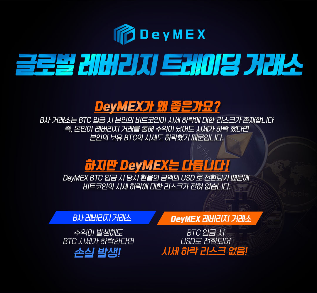 하지만 데이맥스(DeyMEX)에서는 BTC 입금 시 당시환율의 USD로 전환되기 때문에 비트코인의 시세에 대해 영향이 없을뿐더러 전혀 원금에 대한 리스크가 존재하지 않습니다!