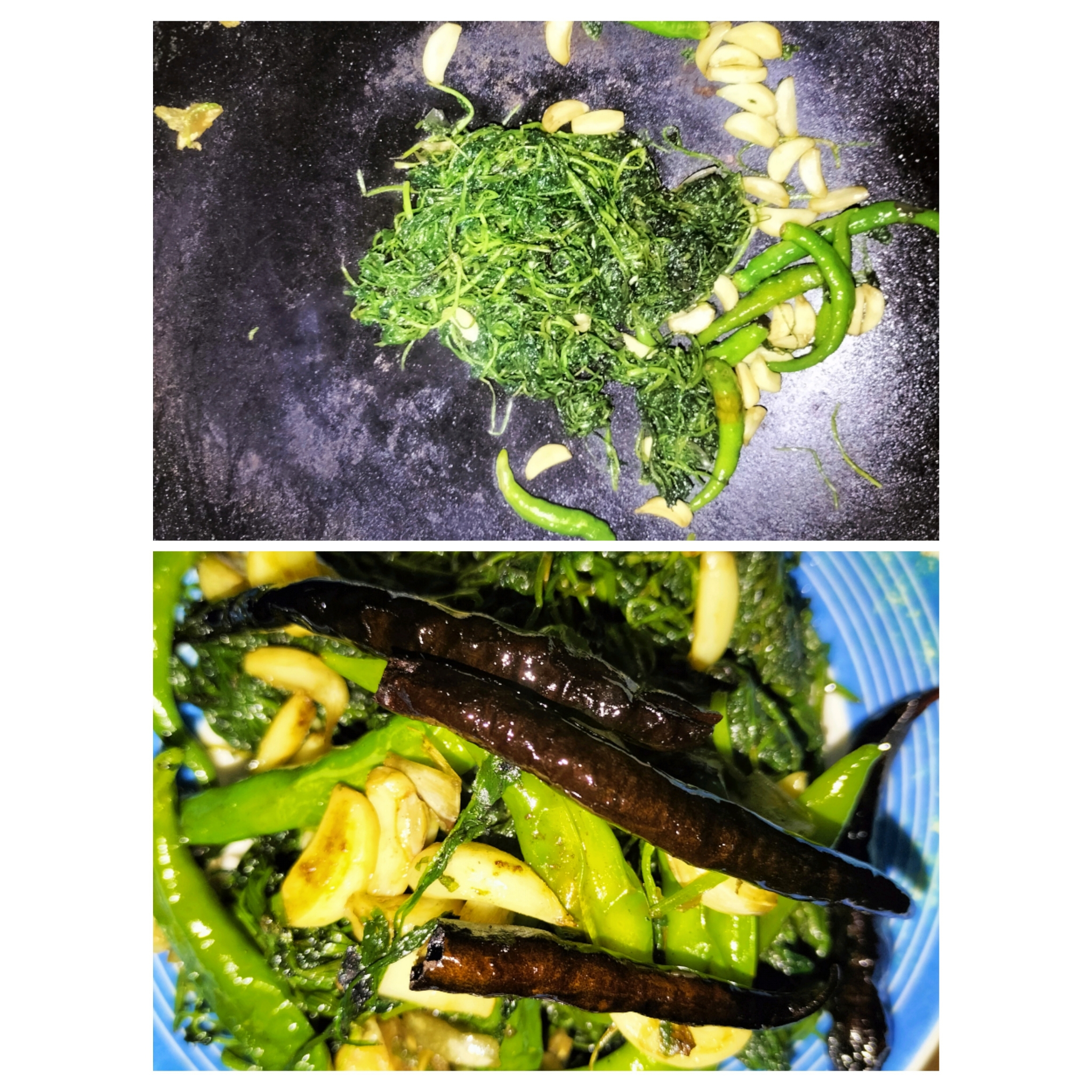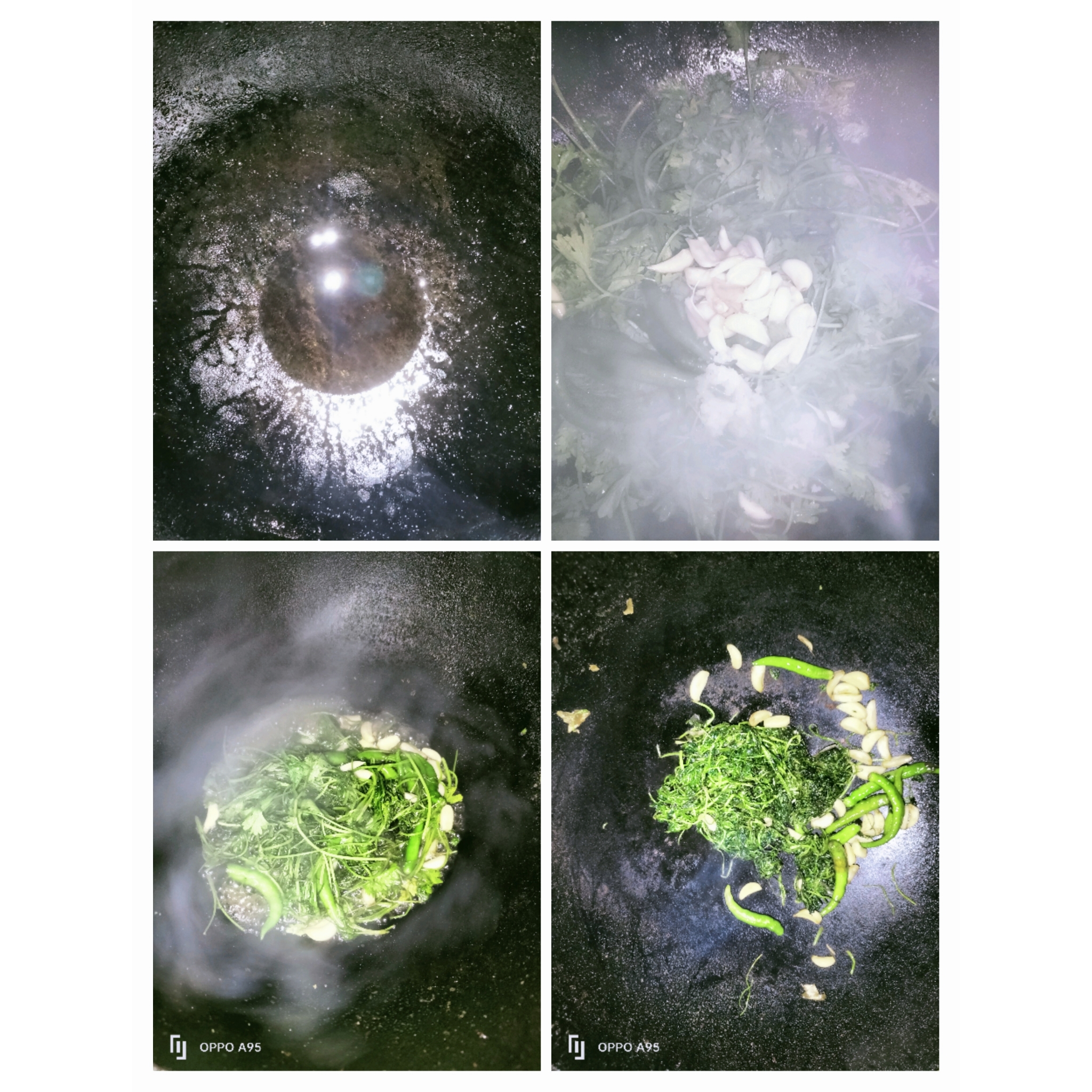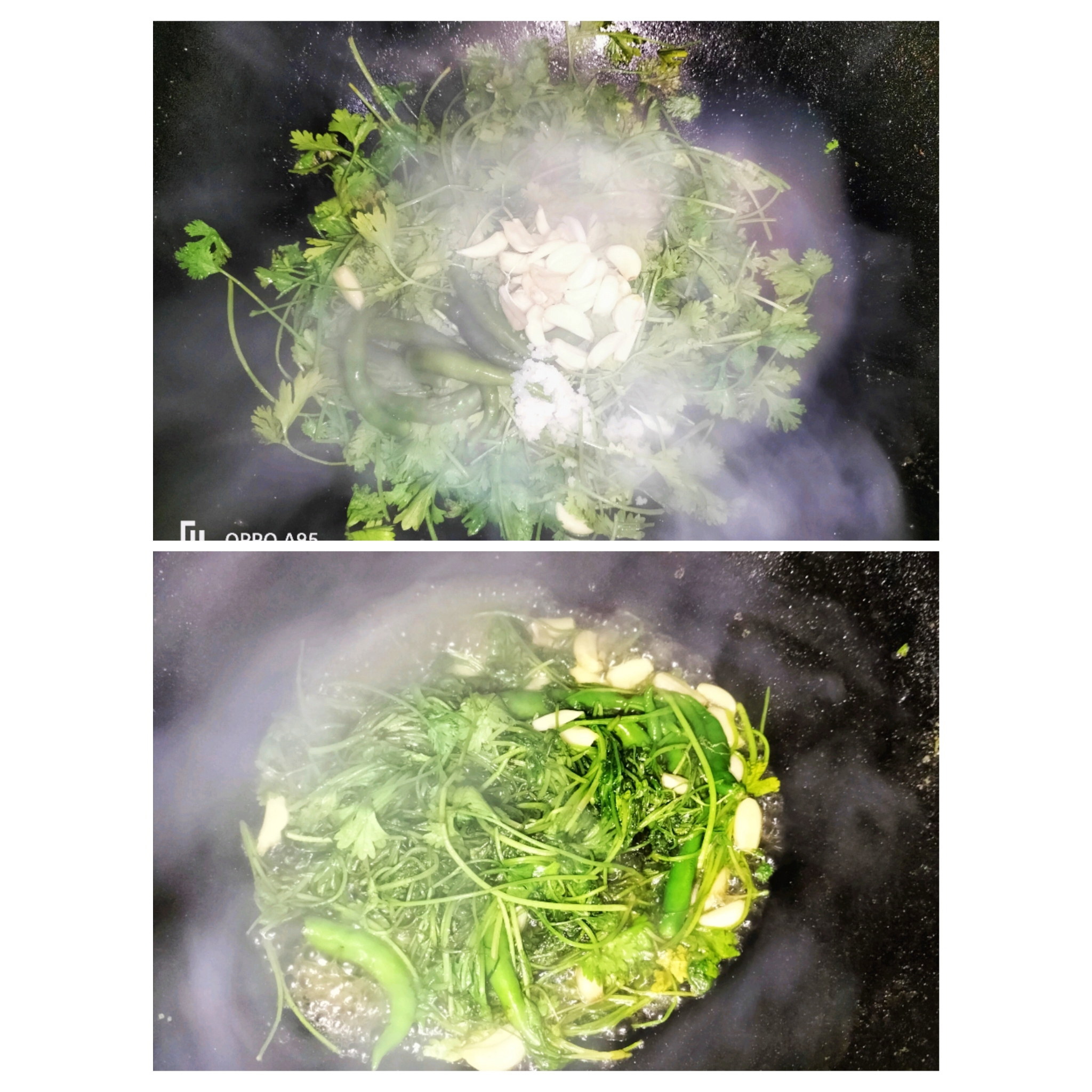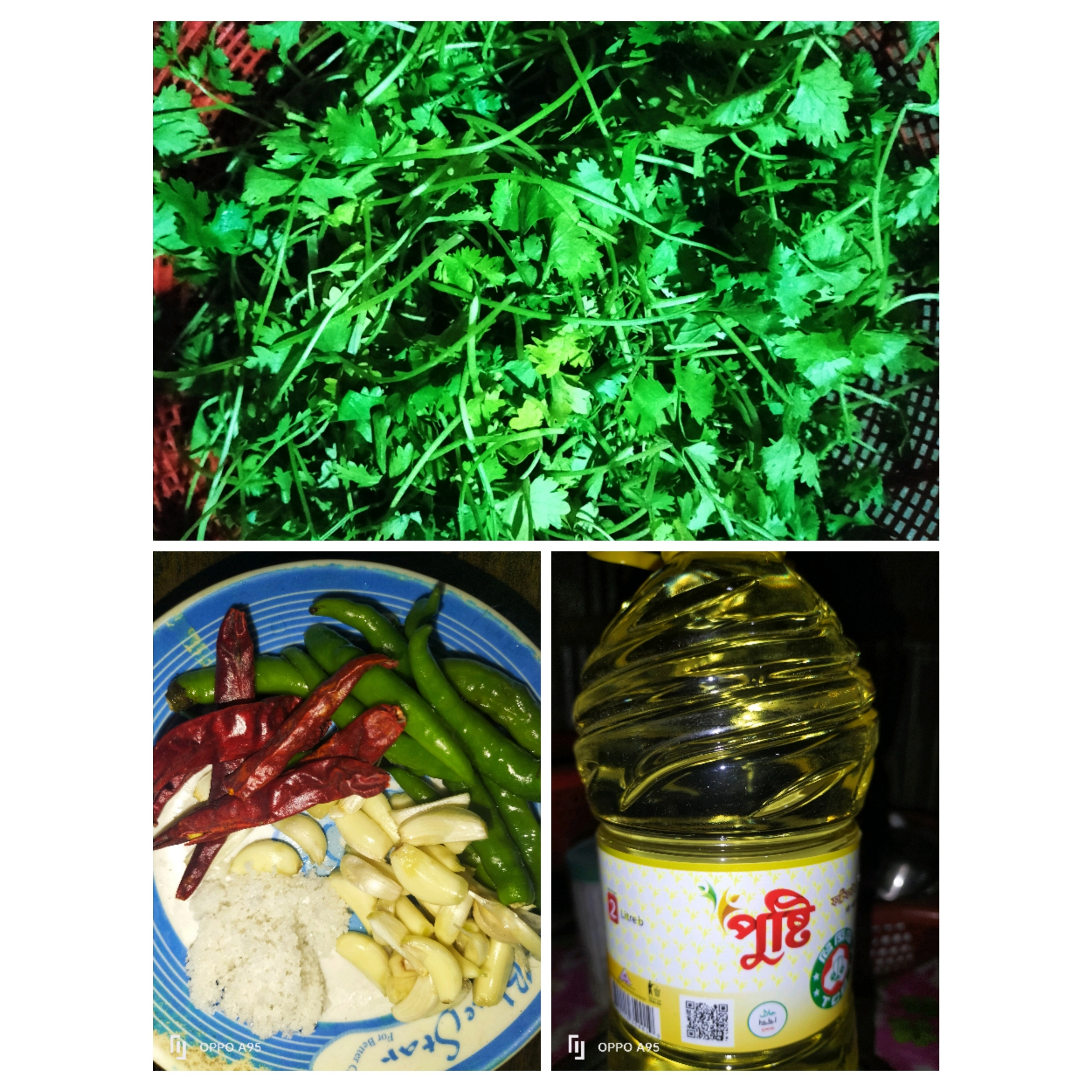 এখন চুলায় কড়াই বসিয়েছি ও পরিমাণ মতো তেল দিয়ে তাতে ধনেপাতা দিয়েছি।তাতে কাঁচা মরিচ ও রসুন দিয়েছি।