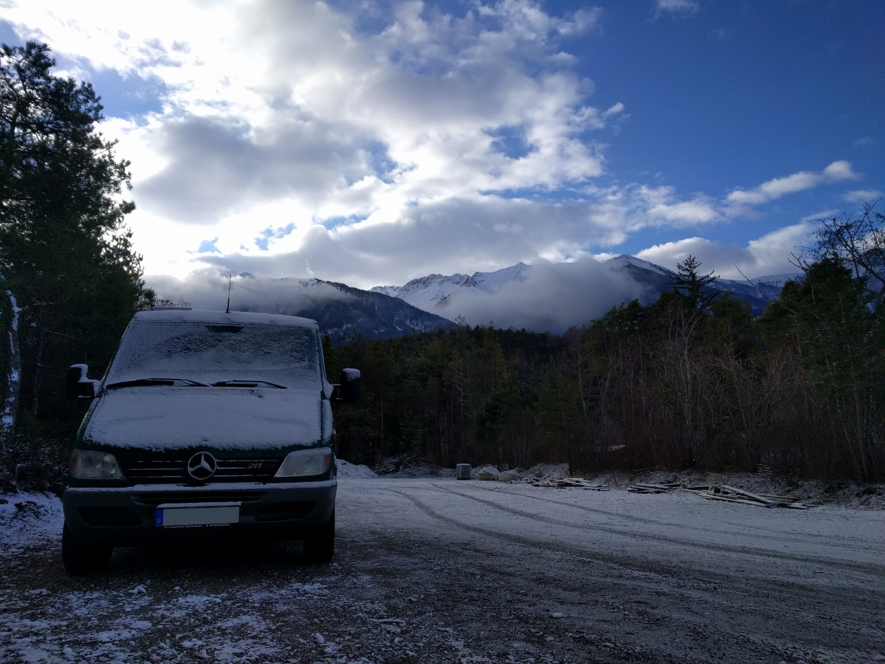 Tonight we have barely escaped a snowy onslaught of ice on the highway, parking for the night in a park4night parking spot that seems to allow vans for a night provided they don't set up camp and get going the next day. The Austrian laws sound rather strict for public parking spot stays overnight but we've had no issues and everybody seemed genuinely welcoming.