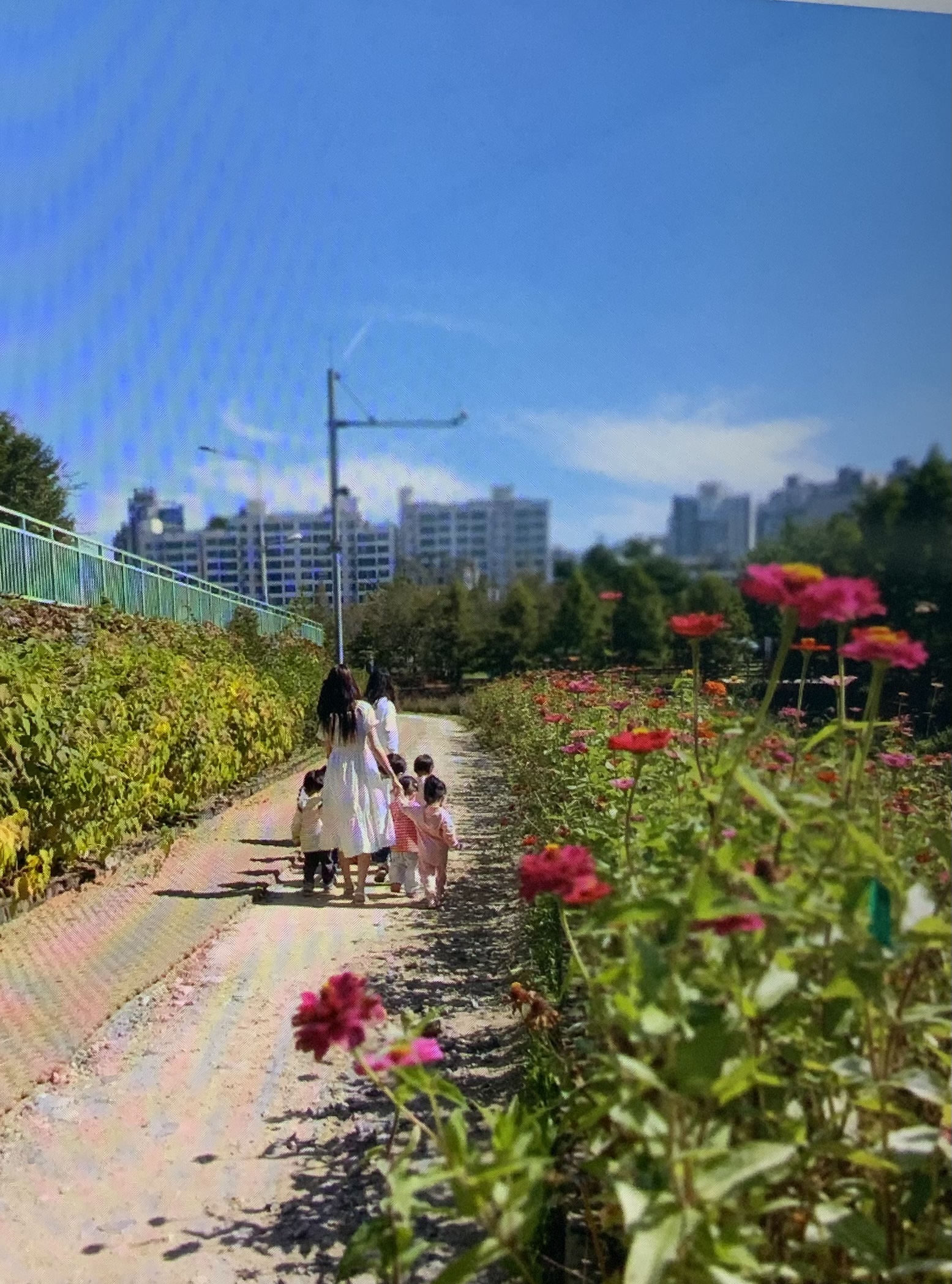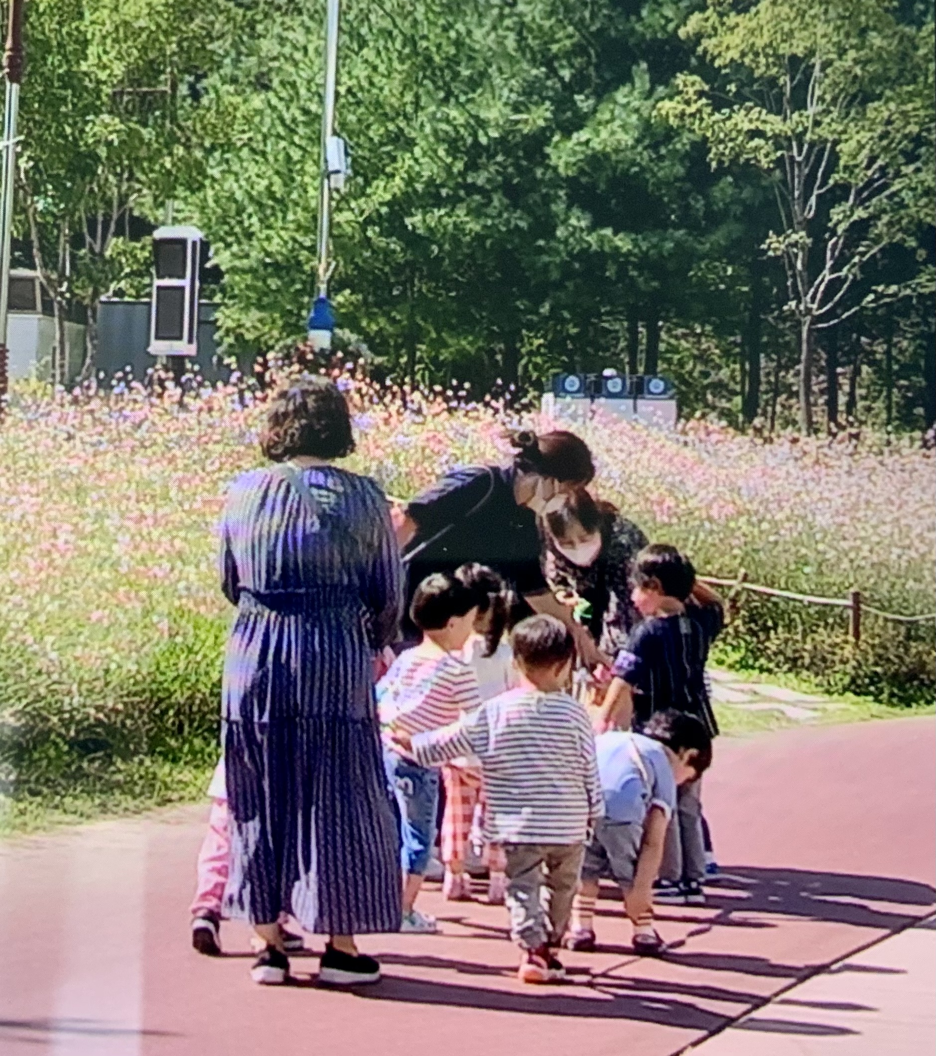 모습은 볼수 없고 단지 꽃밭에서 사진 찍고는