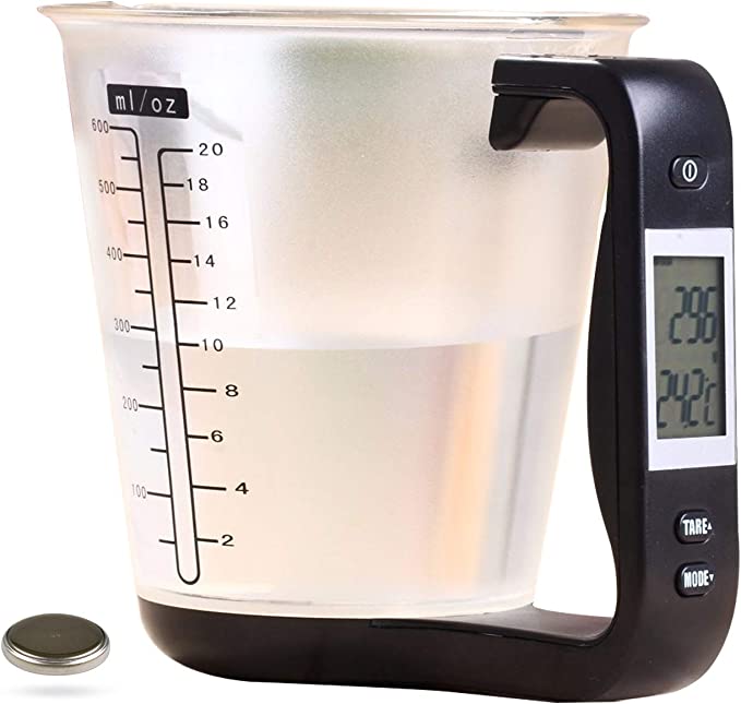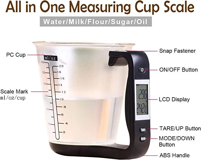 All in One Measuring Cup:new All in One Digital Measuring Cup Scale with LCD Display Weight & Temperature scale inside measuring cup. Perfect for kitchen weighting, baking, tea weighting, coffee and milk weighting, seasoning weighting, medicinal materials weighting.