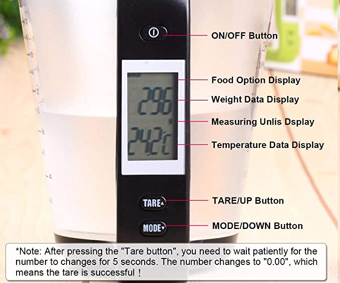 Digital Weight Measuring:Intelligent weighing for five types (Water/Milk/Flour/Sugar/Oil) of food ingredients from ounces to cups. Convert Measuring units for G/ML/OZ/CUP/CT/LB.