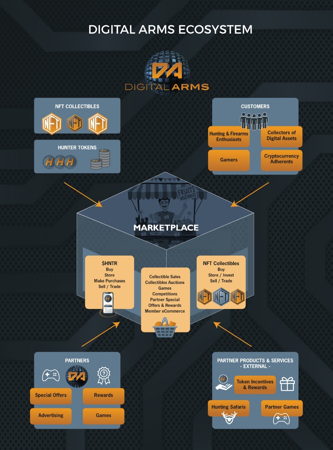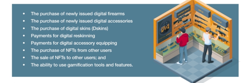 Digital firearms is an environment for those who own firearms physically and for those who admire and value firearms as tools and artefacts. Digital firearms with the aid of the HNTR provide the highest utility and services to users as they purchase firearms and other accessories with the use of the HNTR. The Digital Arsenal is the centre for firearm fans and accumulators. There is a space where the users can look through firearms of diverse varieties, makes, standards and colours that are being sold, acquired, traded and upgraded. Some of the benefits of having HNTR is to purchase; new issues of firearms digitally, accessories, NFTs from other users, to use different tools and features on the platform for ease of use.