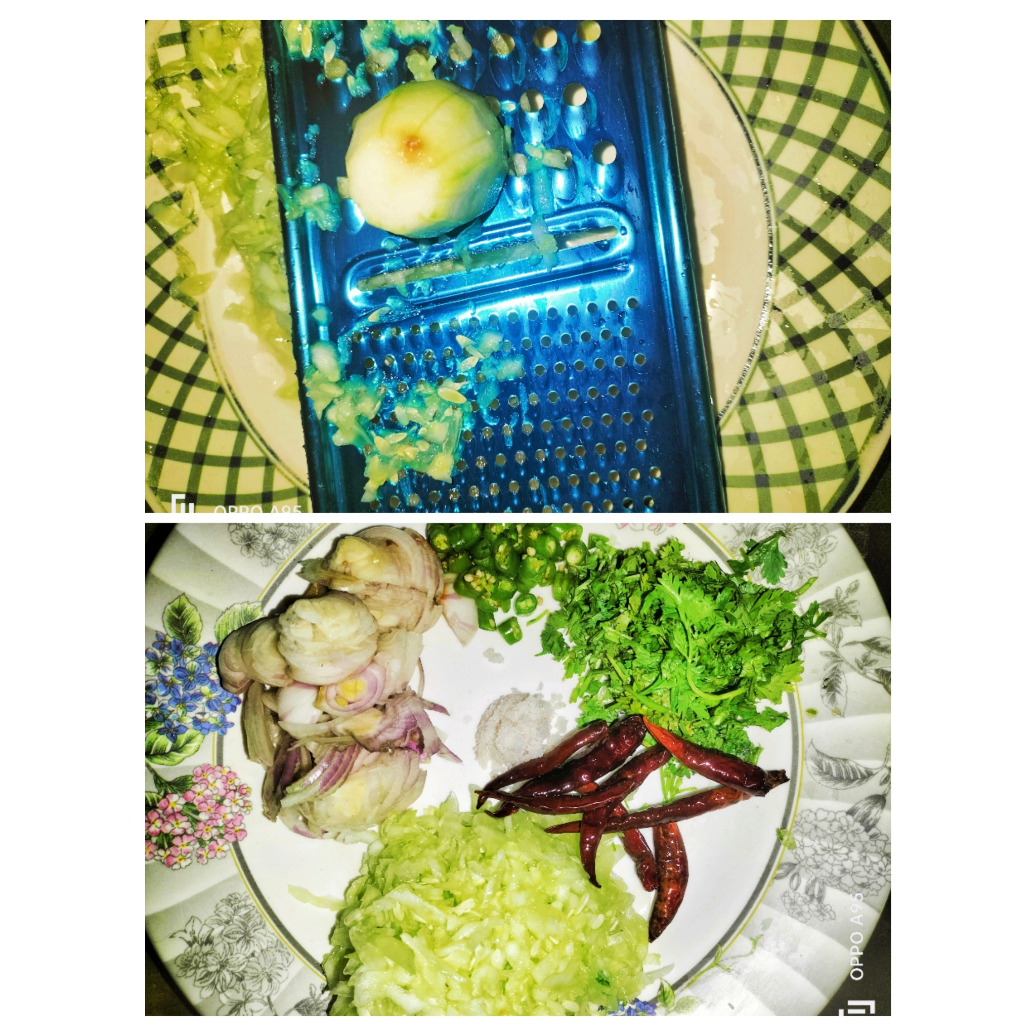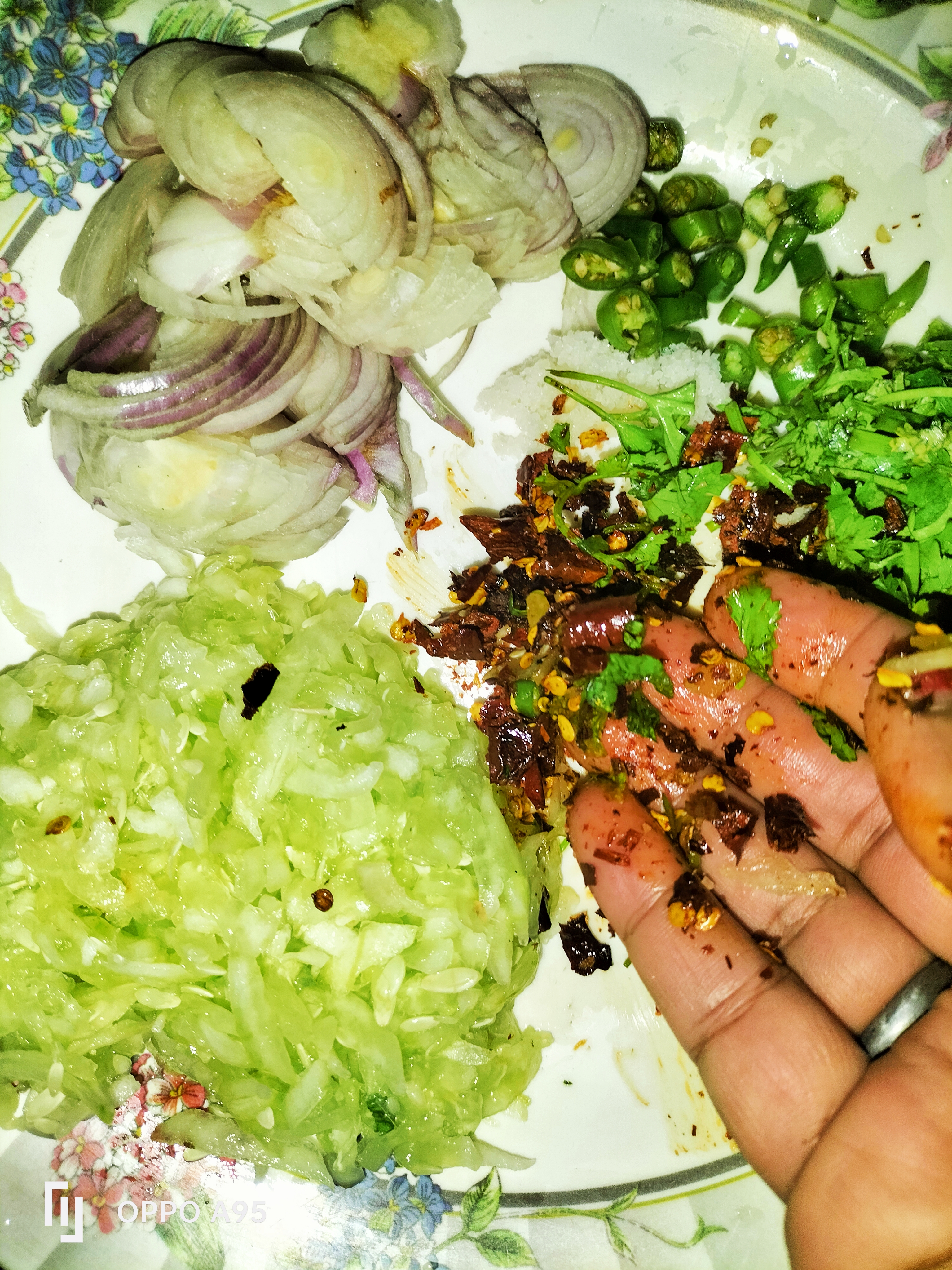 এখন কাচাঁ মরিচ, ধনে পাতা, পেঁয়াজ, শশা কুচি করে কেটে নিয়েছি। শুকনো মরিচ ভেজে নিয়েছি।