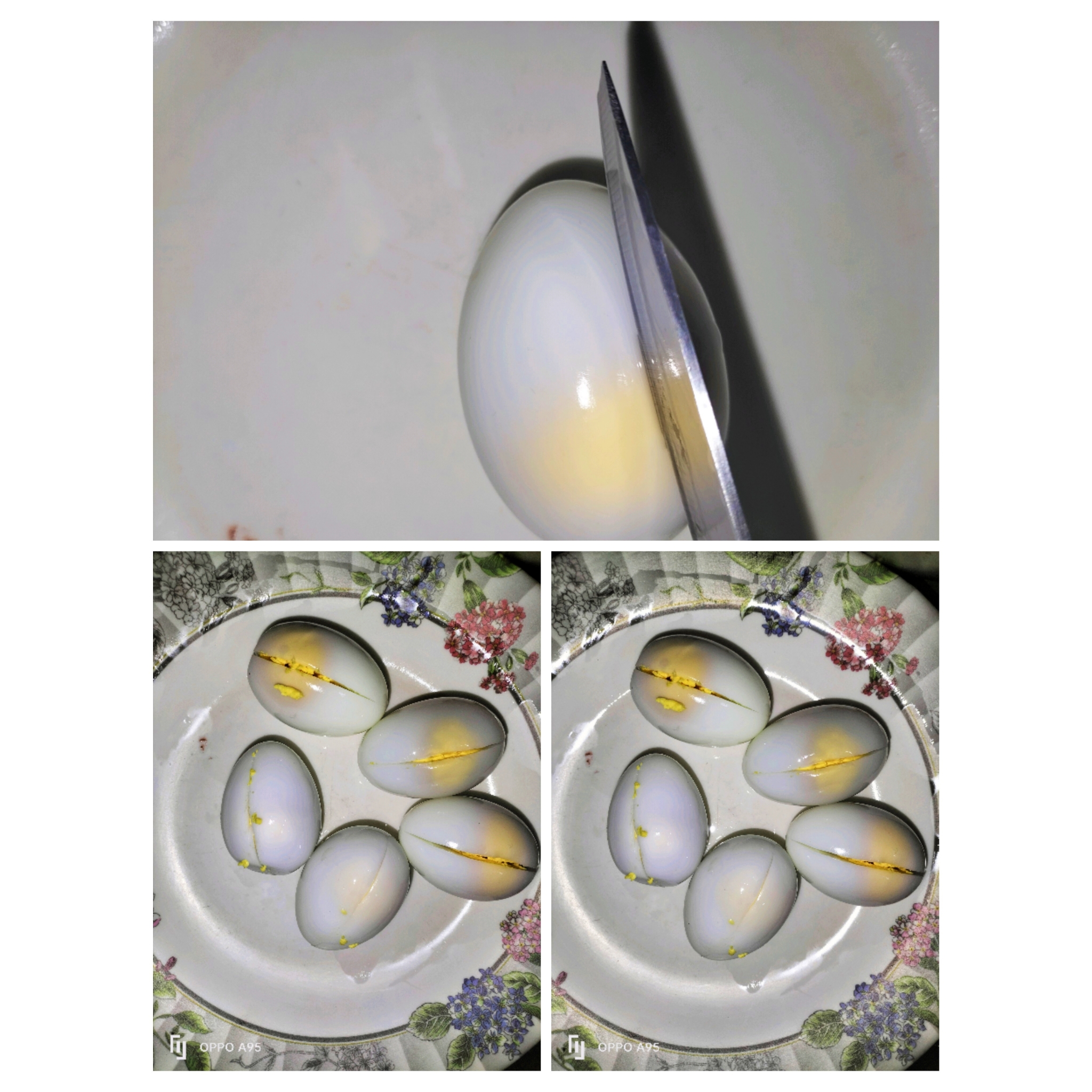 এখন আগে থেকে সিদ্ধ করে রাখা ডিম গুলো একে একে মাঝে চাকুর সাহায্যে কেটে নিয়েছি। একদমই পুরাপুরি দু খন্ড করে নেইনি মাঝ বরাবর চিরে নিয়েছি ডিপ করে।