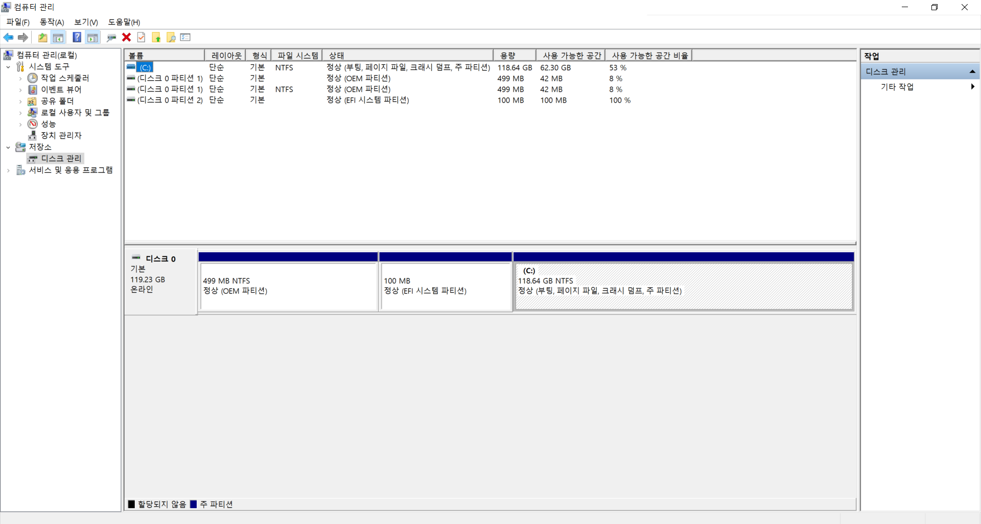 Free-Dos, 128G SSD 노트북에 Widows 10 클린 설치를 하면 아래와 같이 파티션이 나뉜다.