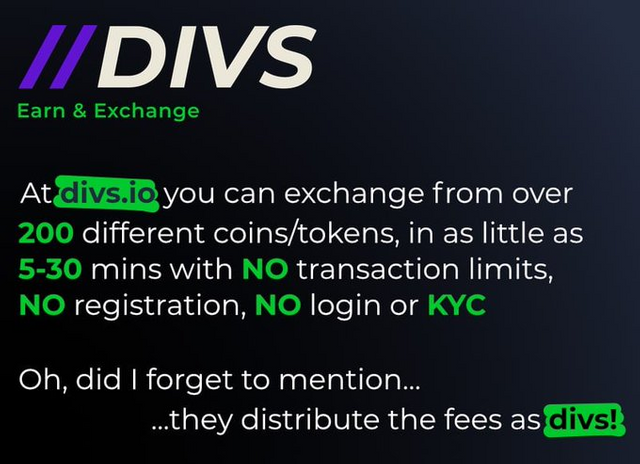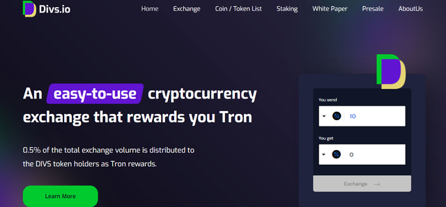 Divs, the first exchange to reward users with exchange fees. We've changed the old concept of an exchange that rewards users to personally exchange large amounts of cryptocurrency just to discount future trades. For example we calculate most of the exchange fees equal to 0.5% of the total exchange volume and distribute it to stake DIVS token holders. It's all users to buy DIVS tokens and get exchange fees as weekly rewards on Tron. Staking new Divs tokens can earn you even more as a reward then you pay the exchange fee, making the exchange almost free and then some!Divs as a