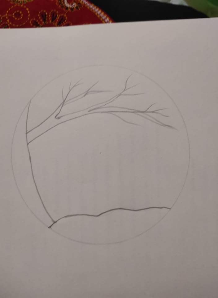 এ পর্যায়ে বৃত্তের উপরের পরিধির একটি বিন্দু থেকে নিচের বক্ররেখা পর্যন্ত একটি বক্ররেখা টেনে যুক্ত করি। এরপর উপরের বক্ররেখা থেকে একটি গাছের ডালের শাখা অঙ্কন করি।