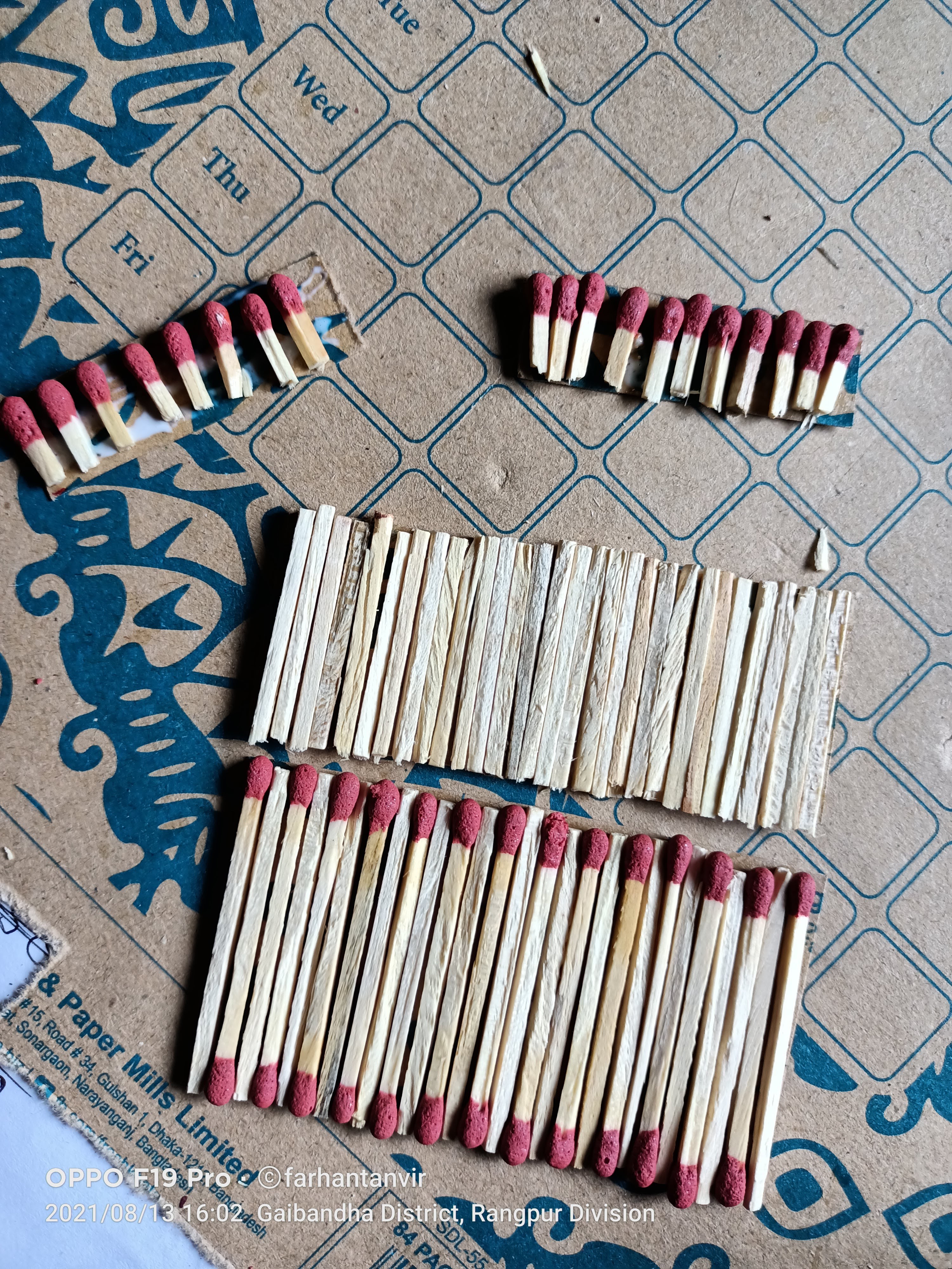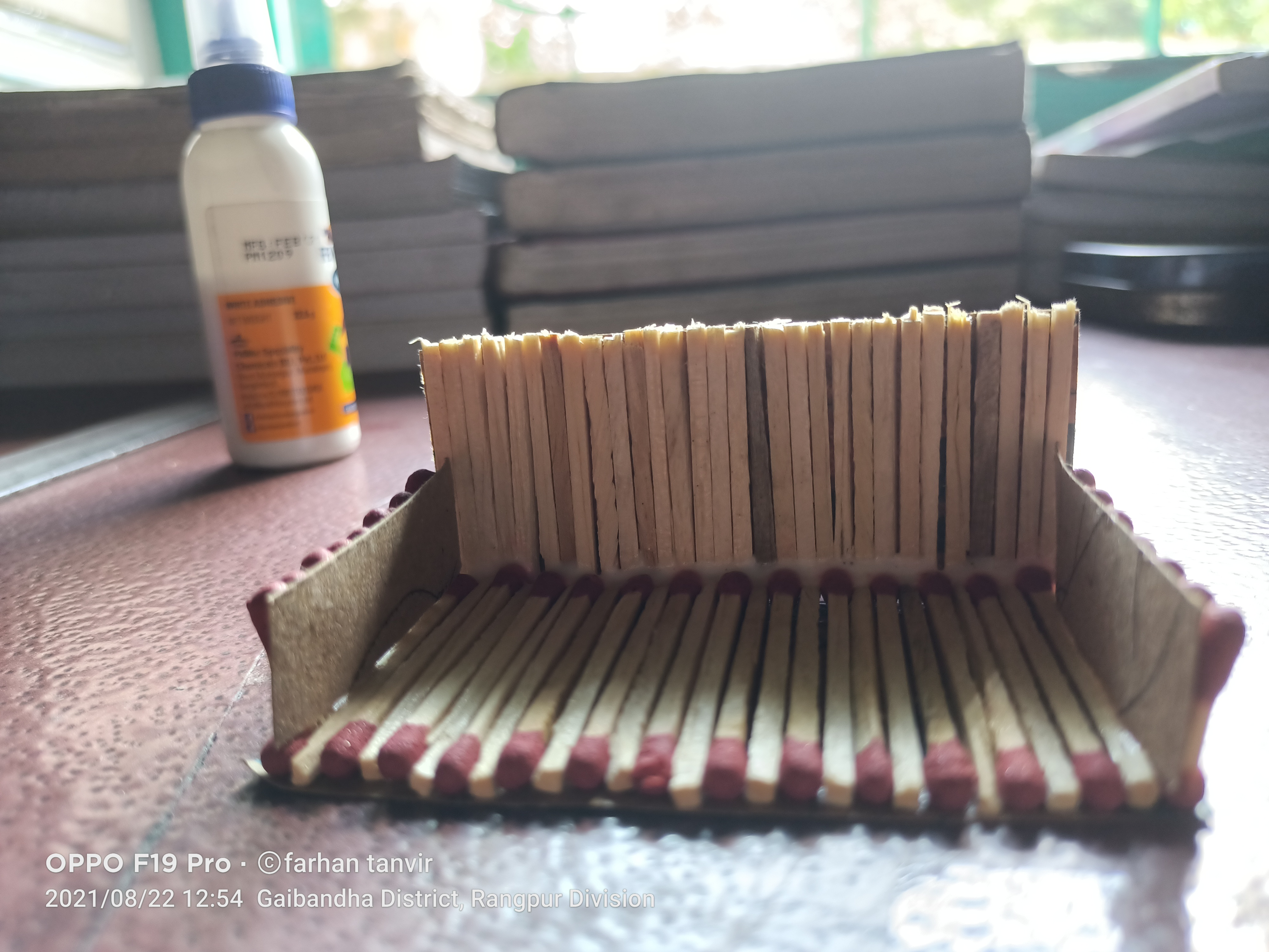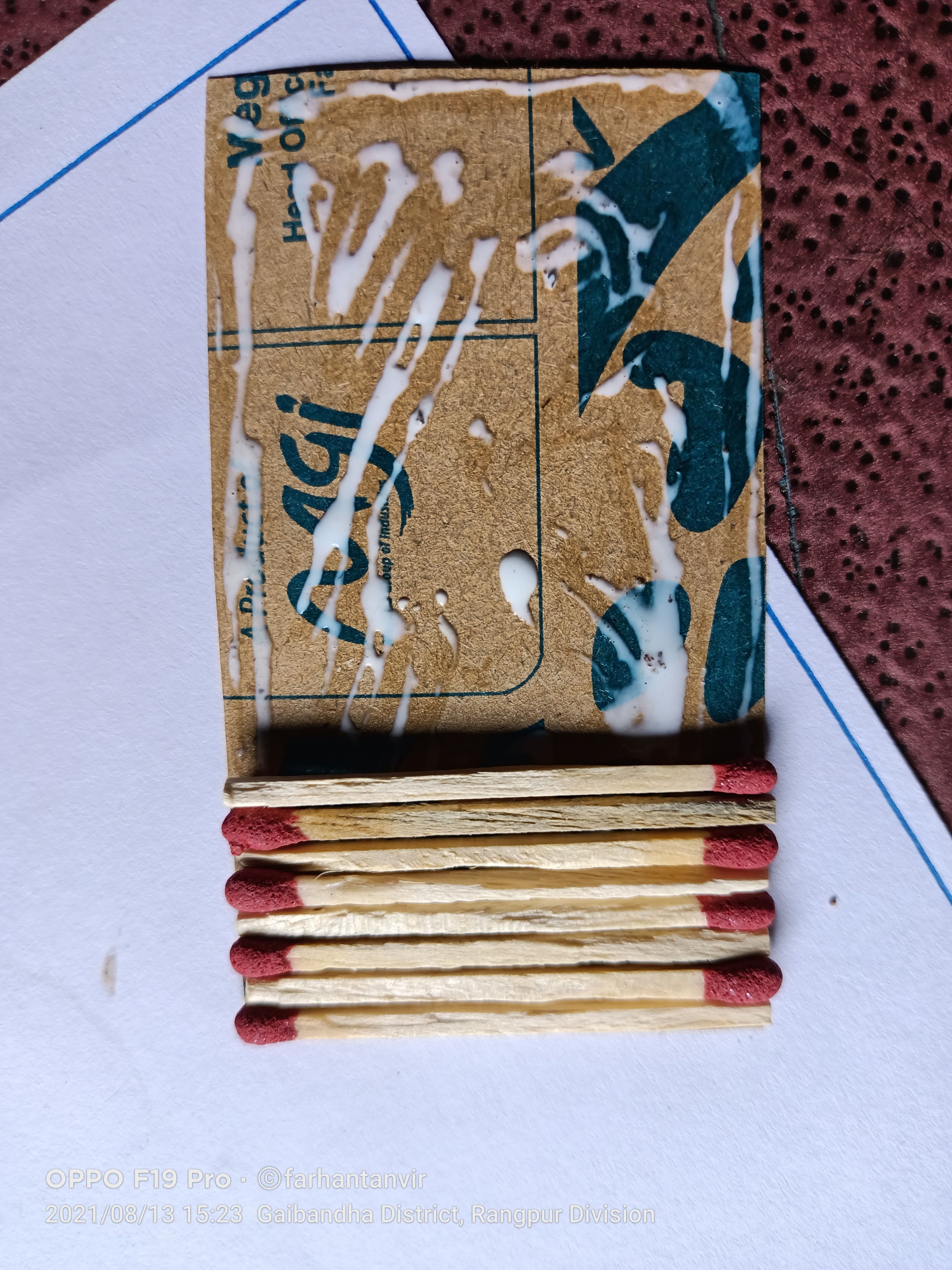 কেটে নেওয়া চারটি কাগজের উপরই এবার ফেভিকল লাগিয়ে নিয়ে দিয়াশলাই কাঠি আটকে দিতে হবে।