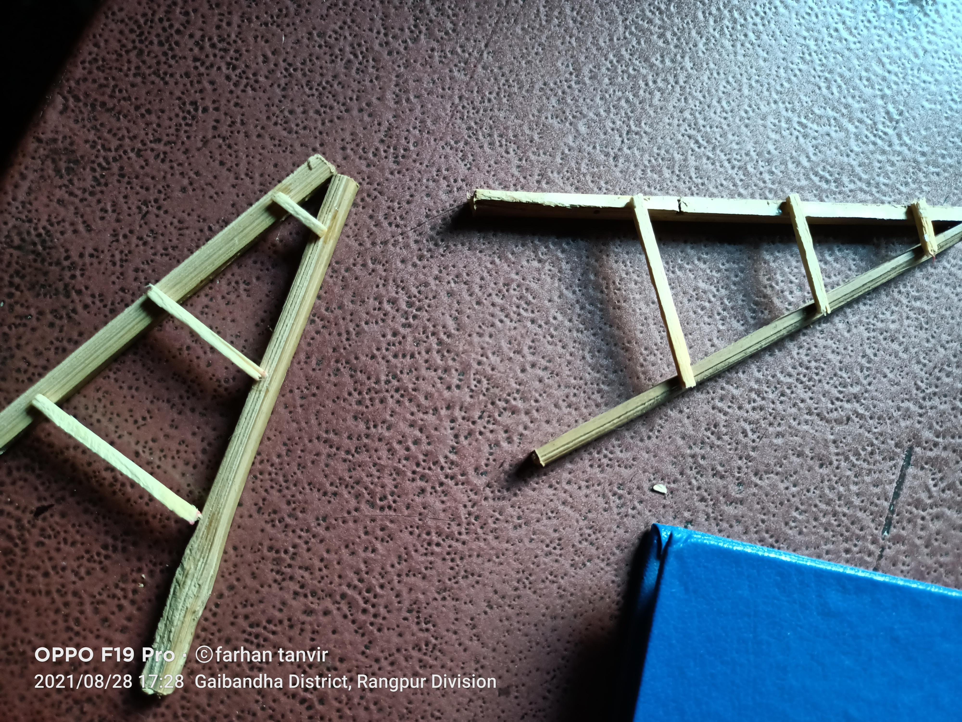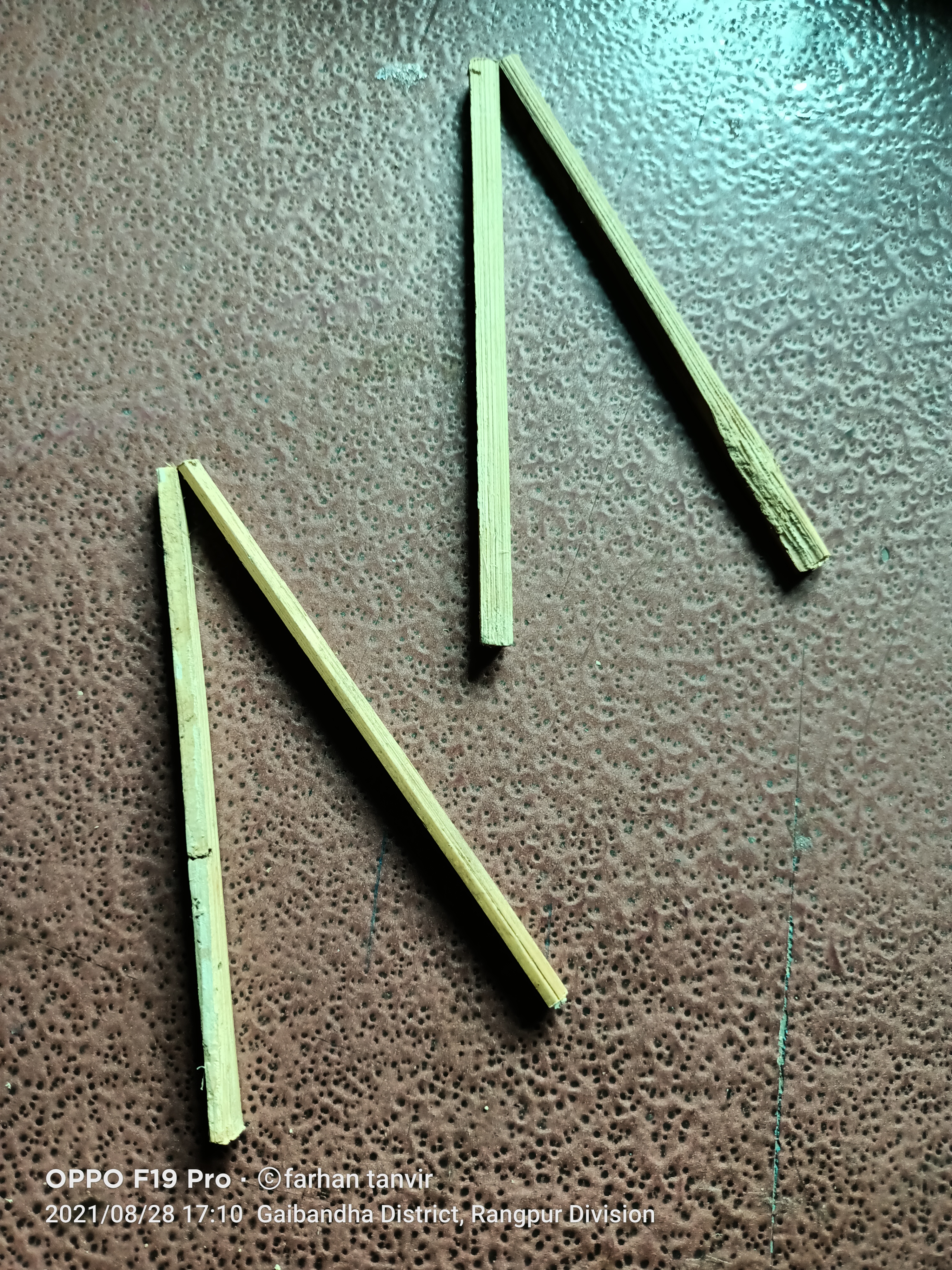 কাঠি বা স্ট্র যাই নিন না কেন সেটার সমান চারটা অংশ নিবেন।তারপর দুইটি করে জোড়া লাগিয়ে কিছুটা ইংরেজি বর্ণের এ আকৃতিতে আনবেন।